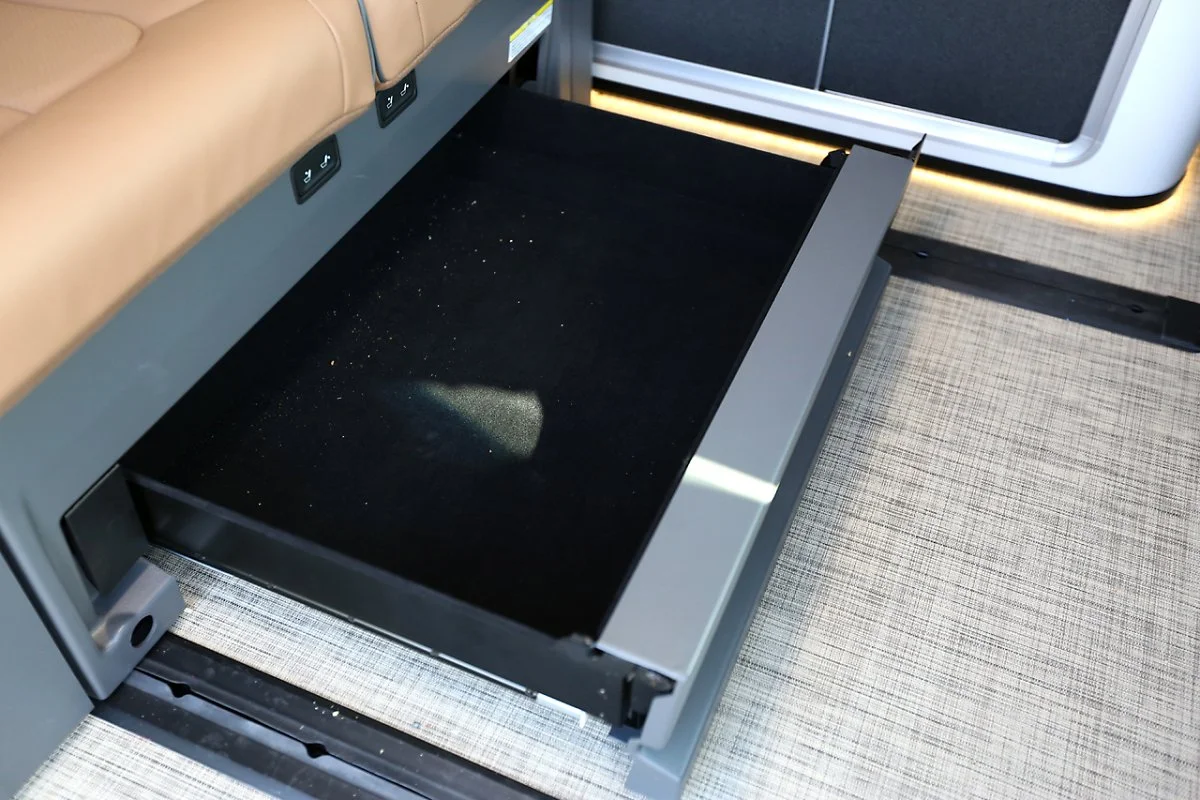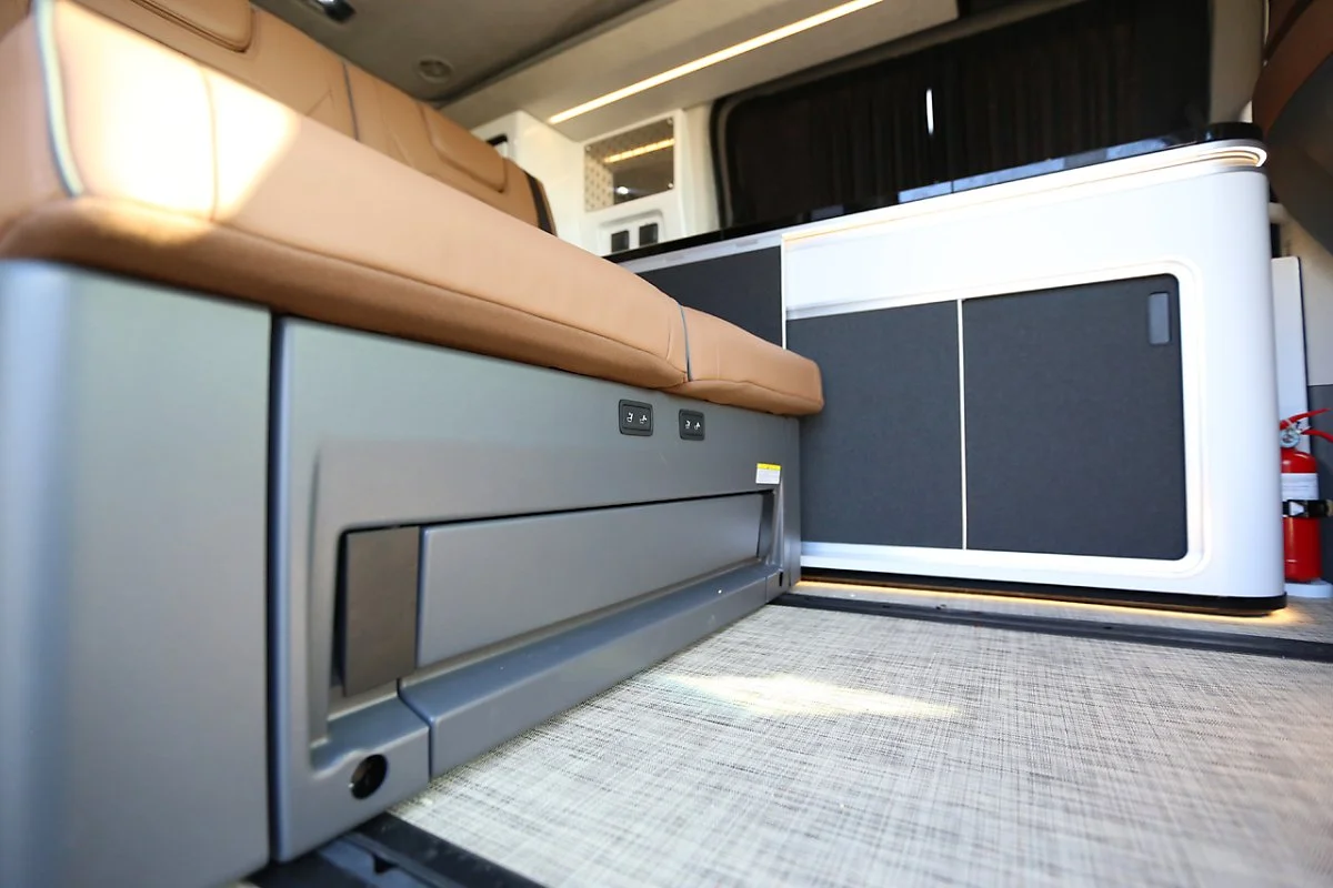 이 체급 캠핑카들의 난제가 수납공간입니다. 침실로 변경하면 짐을 치울 곳이 없거든요. 그러나 스타리아 라운지 캠퍼 4의 수납공간은 시트 하부의 서랍과 측면 가구에 준비되어 있습니다. 자투리 공간으로 상단 선반도 마련되어 얇고 긴 짐도 보관할 수 있는데요. 취침 모드 시에는 시트 하부에도 짐을 적재할 수 있고, 주행 중에는 시트를 펼치거나 접은 상태로도 적재할 수 있습니다. 자투리 공간은 2열 시트 측면과 1열 시트 후면부 등의 곳곳에 마련해 두었습니다. 또한 모든 수납장에는 내부 마감이 되어 있어 주행 중에도 소음이 발생하지 않도록 했습니다.