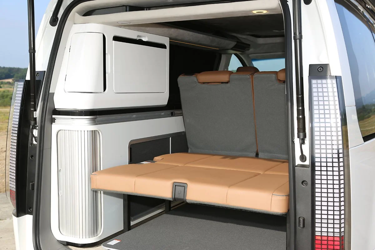 2명 이상이 취침을 해야 하는 상황이라면 거주 공간도 침실로 변환해야 합니다. 이때는 2열 시트를 앞으로 당겨서 그대로 눕혀주면 바로 침실로 바꿀 수 있습니다. 매우 단순하고, 직관적인 변환 방법입니다. 1층 침실 공간은 굉장히 길기 때문에 여유 공간에는 약간의 짐도 보관할 수 있습니다.