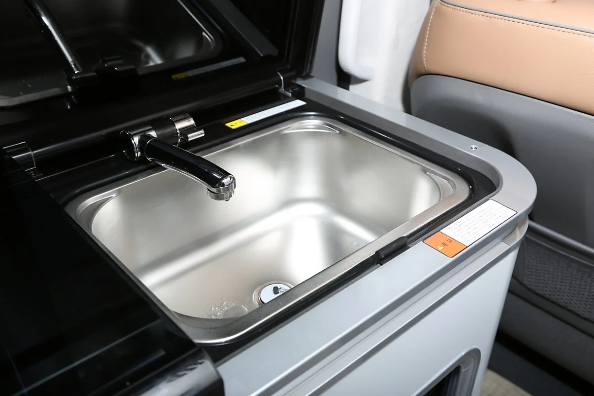 캠핑카에서 가장 중요하고, 기본이 되는 요소는 물과 전기입니다. 스타리아 라운지 캠퍼 4에는 청수가 무려 70ℓ, 오수는 40ℓ에 달합니다. 보통 스타리아 캠핑카들의 청소 탱크는 50ℓ를 넘기지 못하는 수준이기 때문에 동급 최고 수준의 용량을 확보한 셈이라고 할 수 있습니다.