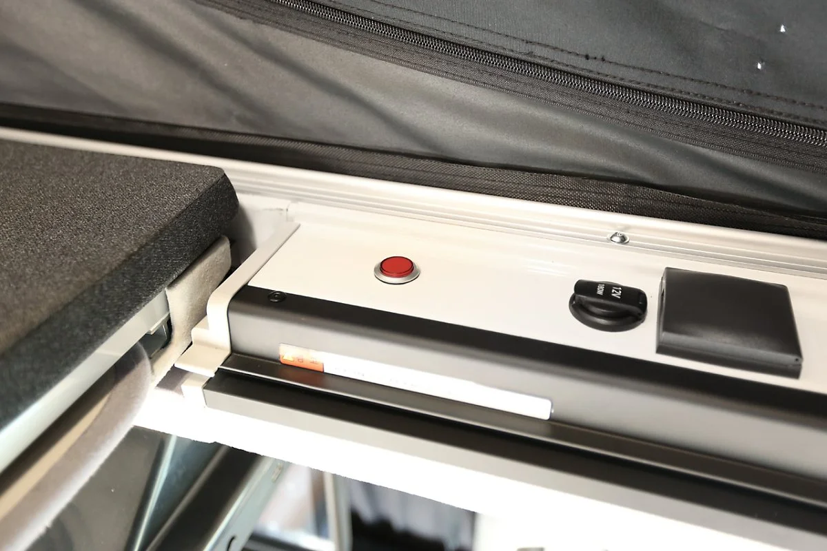 전자동 팝업 루프 시스템은 다른 캠핑카들과 달리 유압이 아닌, 전동식으로 작동하는데요. 전동식은 단가가 비싸지만, 유압 시스템과 달리 주기적인 관리가 필요 없고, 겨울철에도 일정한 성능을 유지하는 장점이 있습니다. 또한 웨더 스트립을 안쪽으로 설계해서 팝업 루프를 닫았을 때 깔끔한 모습을 보이기도 합니다.