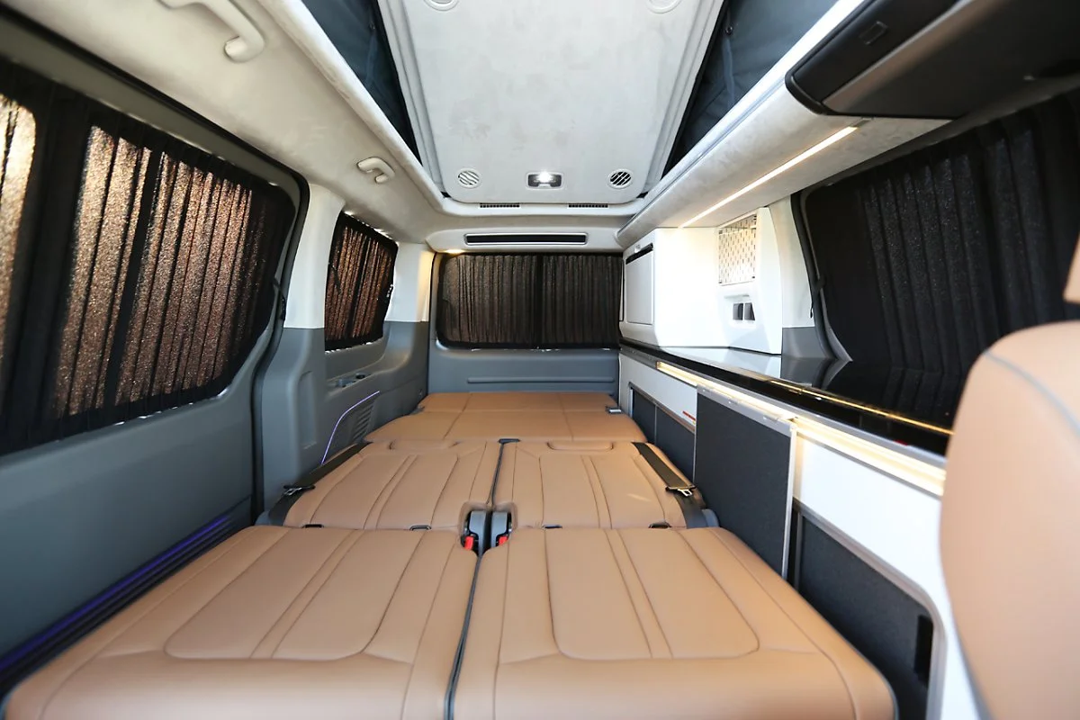 스타리아 라운지 캠퍼 4의 디자인은 기본 모델의 디자인 방향성을 그대로 이어받았습니다. 그래서 넓고, 쾌적하면서도 고급스러운 분위기를 연출하는 것이 특징입니다. 2열에도 2명이 탑승할 수 있는 총 4인승 구조이기 때문이 시각적으로 쾌적한 모습인데요. 측면 가구도 낮고 넓게 펼쳐져 공간감을 극대화해 줍니다.