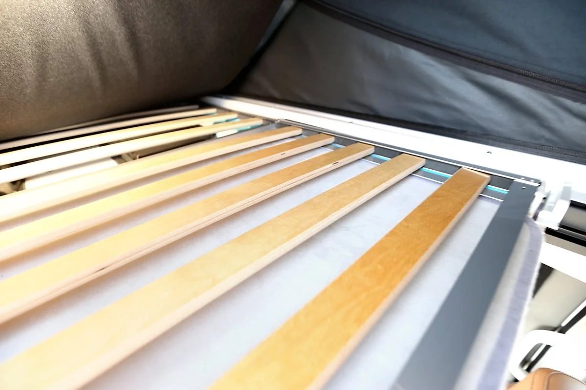 침실은 어떻게 만들 수 있을까요? 총 두 가지 방법이 있습니다. 2인 이하의 인원이 사용할 때는 팝업 루프를 개방하면 아래 공간을 거주공간으로 활용하면서 윗부분만 침실로 활용할 수 있습니다. 2층에는 유럽형 침대 프레임과 매트리스가 마련되며, LED 램프, 220V 단자도 있습니다. 성인 남성 두 명이 사용해도 적당한 공간 확보가 가능하며, 3면을 개방할 수 있어 환기성도 우수합니다.