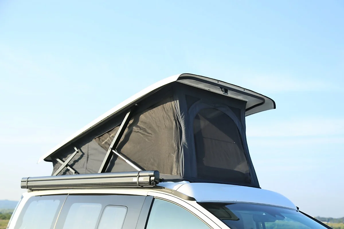 2층 팝업 루프를 개방한 상태로 내부 천장을 밀어 올려 거주 공간을 평상형으로 여유롭게 사용하면 환기나 통풍에도 유리합니다. 성인 남성이 서서 옷을 갈아입어도 머리가 닿을 수 없을 정도로 천장이 높아지기 때문에 굉장히 쾌적한 내부 생활도 가능합니다.