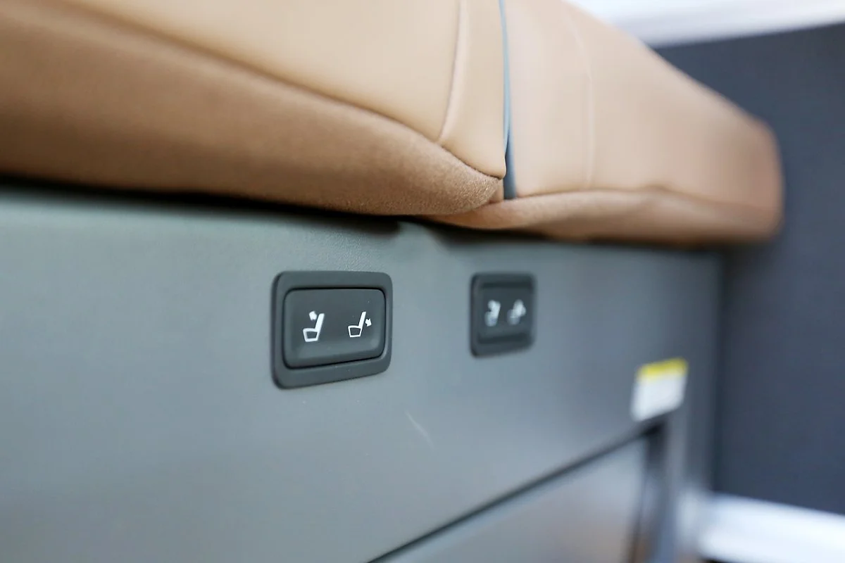평상시 시트 디자인도 기본 모델과 디자인 방향성을 일치 시켰습니다. 다만, 침대로 변환을 해야 하는 특성상 헤드레스트가 시트 내부로 들어가도록 설계된 점이 일반 시트와 가장 큰 차이점입니다. 대신 3점식 시트벨트 및 ISOFIX를 지원하고, 등받이도 5:5 분할 전동 조절이 가능해서 주행 중에도 쾌적한 상태를 유지할 수 있는 기능은 여전히 포함하고 있습니다.