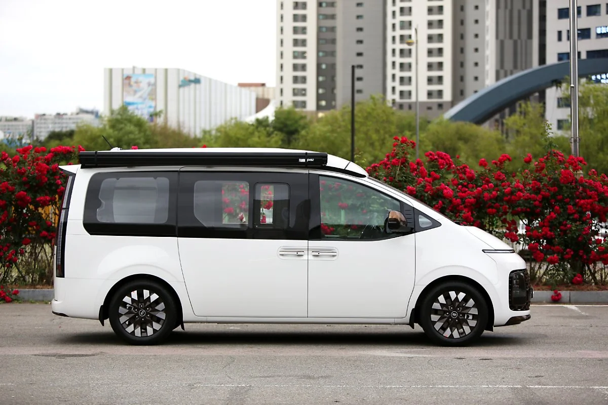 일반모델과 디자인적으로 다른 점은 팝업 루프가 추가되기 때문에 일반 모델 대비 약 10cm 더 높습니다. 2,095mm의 전고는 당연히 지하주차가 가능하도록 설계가 되었는데요. 실제로 스타리아 라운지 기반의 캠핑카 유저들 사이에서 가장 중요하게 여겨지는 것이 지하 주차 가능 여부이기도 합니다. 팝업 루프 디자인을 매우 자세히 보면 앞부분이 약간 더 높고 뒤쪽이 더 낮게 설계되어 있는데요. 이런 디테일이 공기 흐름을 자연스럽게 돕기도 하지만, 주행 중에 팝업 루프가 바람에 의해 개방되는 발생할 수 있는 사고를 방지해 줍니다. 황당한 일이긴 하나, 실제로 그런 사고 사례가 여러 번 있었습니다.