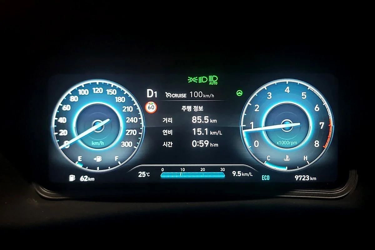 시승을 마치고 복귀하는 길에서 코나 N은 다시 한번 반전 매력을 선보였습니다. 코나 N은 고성능 모델들이 그렇듯 연료 효율성보다는 주행성능에 초점이 맞춰진 차량입니다. 이를 반영해 N 모드에서는 오일 온도와 냉각수 온도 등 주행과 관련된 정보만 표기하고 연비와 관련된 정보는 보여주지 않습니다. 그러나 코나 N은 15.1km/ℓ의 높은 연료 효율성을 기록하기도 했습니다. 이는 에코 모드에서 차간 거리를 조절하는 스마트 크루즈 컨트롤을 주로 사용하고, 순간적인 가속력을 필요로 할 때만 NGS 모드를 사용한 결과입니다.