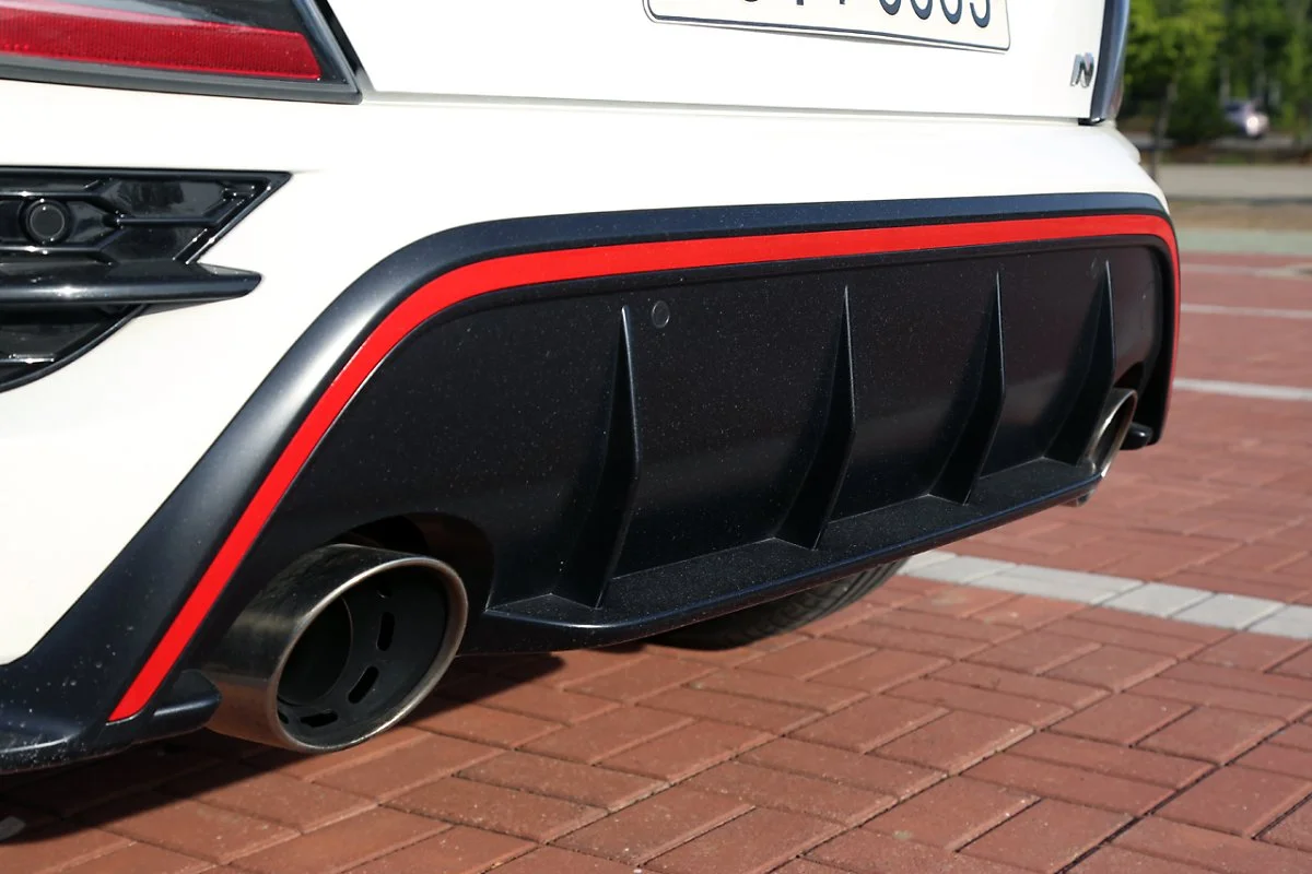 차체 하단부 곳곳에는 N의 상징인 빨간색 엑센트 라인이 들어가 N 모델이라는 것을 강조하고 있습니다. 특히 측면 하단부의 N 사이드 실 몰딩은 해치백처럼 전고가 낮아 보이게 만듭니다. 또한 코나 라인업 중 유일하게 적용된 19인치 휠은 시각적인 만족도를 높여줍니다. 후면에는 삼각형 모양의 보조제동등이 적용된 더블 윙 타입 리어 스포일러, 듀얼 싱글 팁 머플러와 날카로운 디퓨저 등은 N 모델의 특징을 동일하게 반영하는 것으로 마무리했습니다.