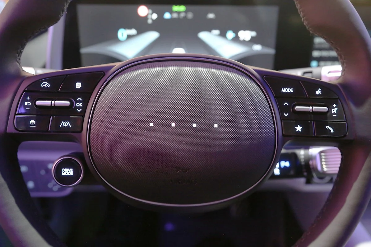 감성적인 요소를 듀얼 컬러 앰비언트 무드램프가 담당한다면 인터렉티브 픽셀 라이트는 차량과 운전자가 마치 교감하는 듯한 느낌을 줍니다. 스티어링 휠 중앙에 앰블럼 대신 위치한 인터렉티브 픽셀 라이트는 4개의 픽셀로 구성되어 ▲웰컴&굿바이 ▲주행가능상태(ready) ▲후진기어 ▲배터리 충전상태 ▲드라이브 모드 전환 ▲음성인식 상태 등을 조명으로 표시해줍니다.