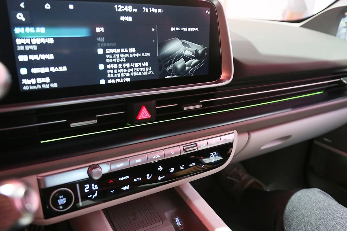 추가적으로 크래시패드 하단에는 웰컴&굿바이와 시동 온/오프, 음성인식 기능 등을 조명으로 표현하는 인터렉티브 LED 라이트도 적용됩니다. 이 라이트는 특히 사용자 및 차량 AI의 음성 크기에 따라 이퀄라이저 형상을 구현하여 음성인식 상태를 시각화 해주기 때문에 다양한 방법으로 차량과 소통, 교감하는 듯한 느낌을 받을 수 있습니다.