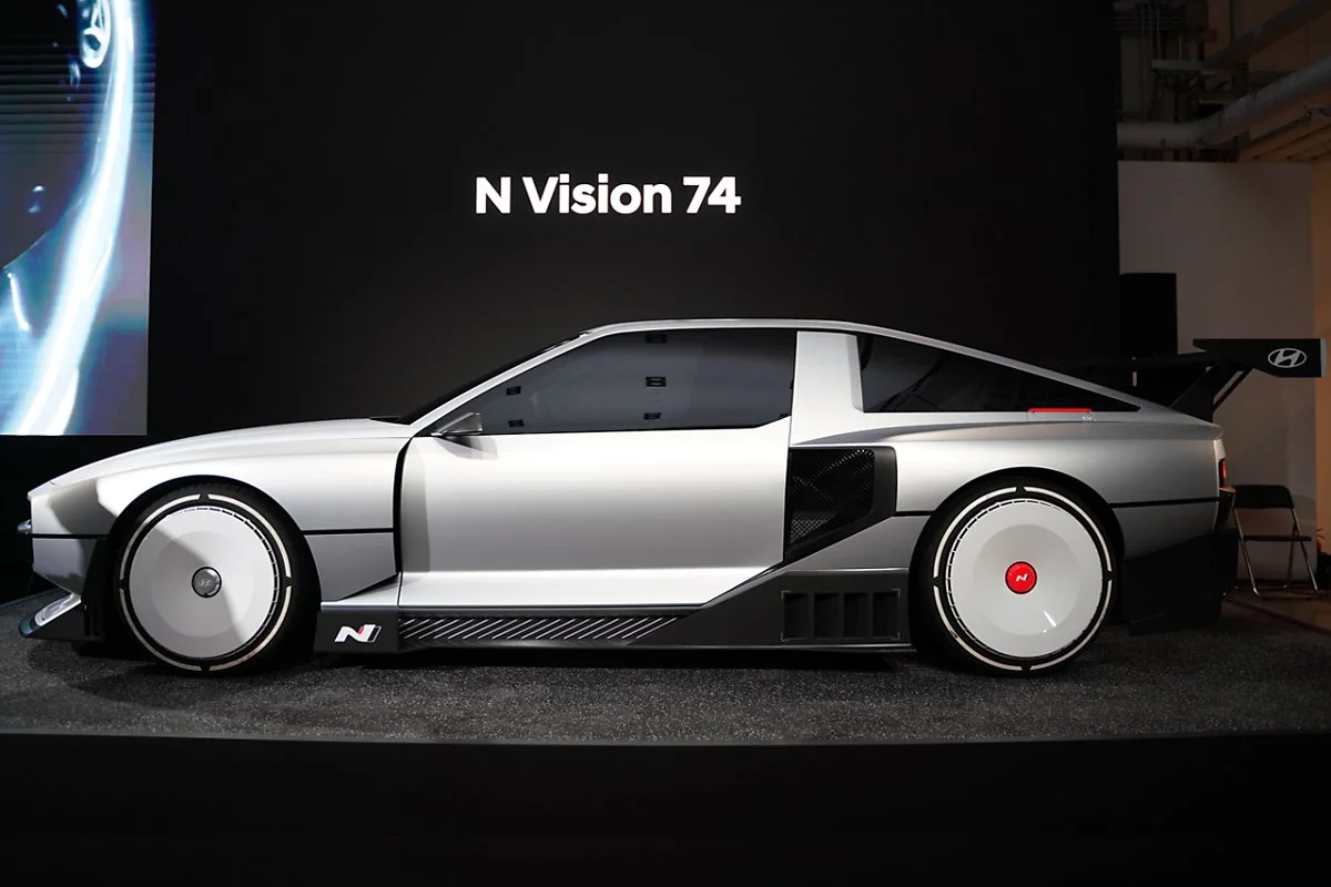 N 비전 74로 돌아와 보겠습니다. N 비전 74를 살펴보면 단번에 포니 쿠페 콘셉트카를 오마주 한 것을 알아차릴 수 있습니다. 포니 쿠페 콘셉트의 상징적인 디자인 요소를 상당 부분 차용한 것인데요. 쐐기형의 차체 디자인과 두터운 B 필러 그리고 B 필러에서부터 스피디하게 떨어지는 루프라인이 포니 콘셉트카와 유사한 모습을 가집니다. 차량 하단부 디테일에서는 현대적인 디자인 요소가 많이 적용됐습니다. 레이스에 특화된 차량의 목적에 맞게 냉각을 위한 거대한 에어 인테이크가 B 필러 밑에 위치한 것이죠.