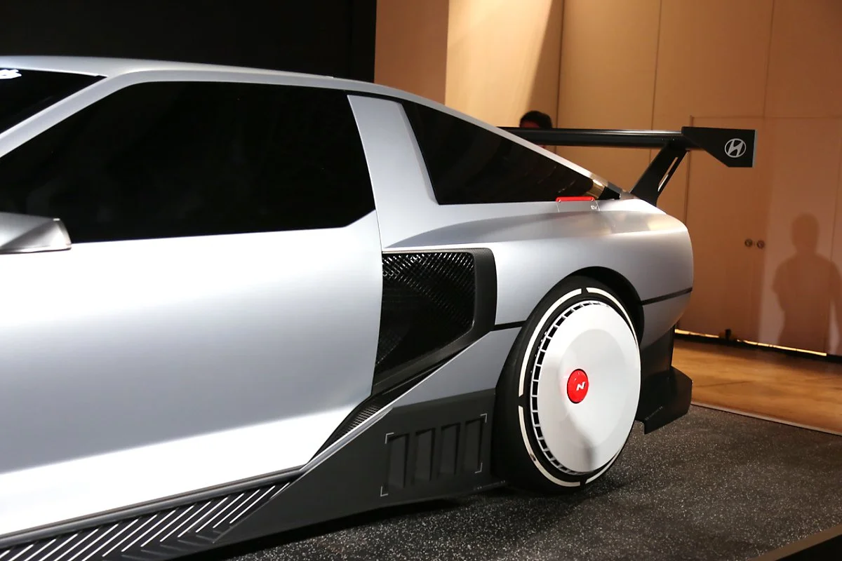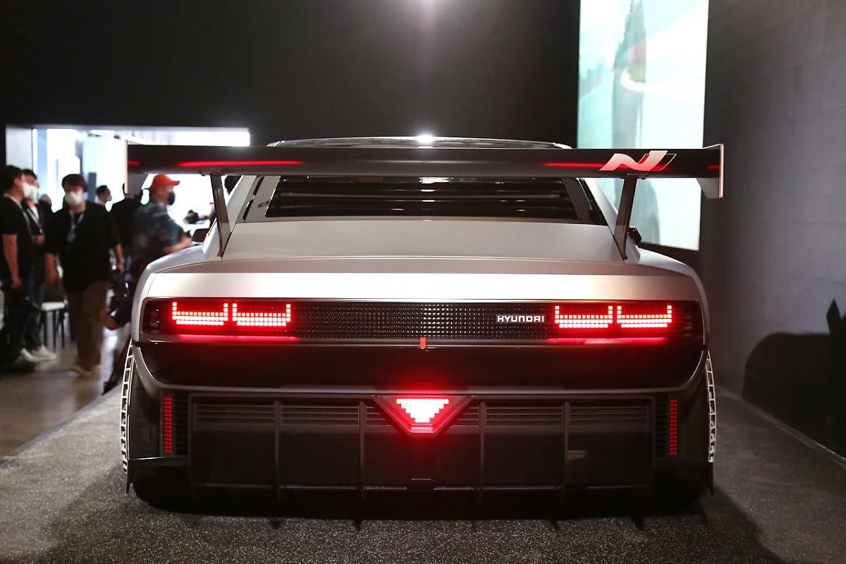1974년 선보인 포니 쿠페 콘셉트카는 곡선은 찾아볼 수 없는 반듯한 면으로만 구성되었다면 N 비전 콘셉트카는 보는 각도에 따라 풍부한 볼륨감을 보여줍니다. 프런트와 리어 휀더에 볼륨이 적용돼 상부에서 바라보면 와이드하며 자세 잡힌 역동적인 모습을 보여줍니다. 후면부에 위치한 거대한 리어윙과 리어 디퓨저는 이 차가 가진 성능을 시각적으로도 적극적으로 표현해 줍니다. 리어 램프 옆에 위치한 현대 로고 레터링은 과거 현대차 차량들에 적용되었던 방식 그대로 차용해 과거에 대한 향수를 불러일으킵니다.