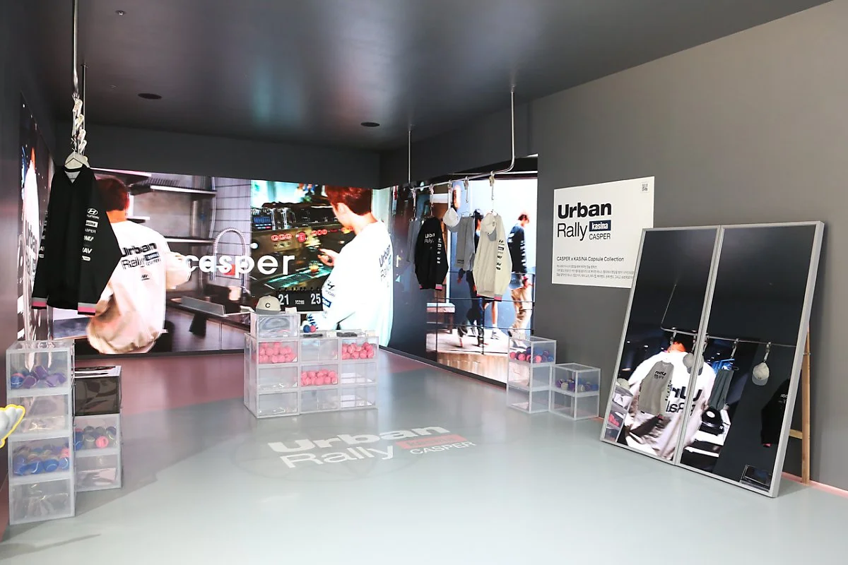 캐스퍼와 카시나의 협업을 통해 제작된 캡슐 컬렉션도 전시되어 있습니다. 이번 협업 콘셉트인 어반 랠리를 중의적으로 해석한 테니스 랠리에서 영감을 받아 디자인되었습니다. 캡슐 컬렉션은 테니스 웜업 저지, 테리 쇼츠, 테리 캡, 헤어밴드, 손목 밴드, 슈브제 등으로 구성되며, 카시나 홈페이지를 통해서 구입할 수 있습니다.