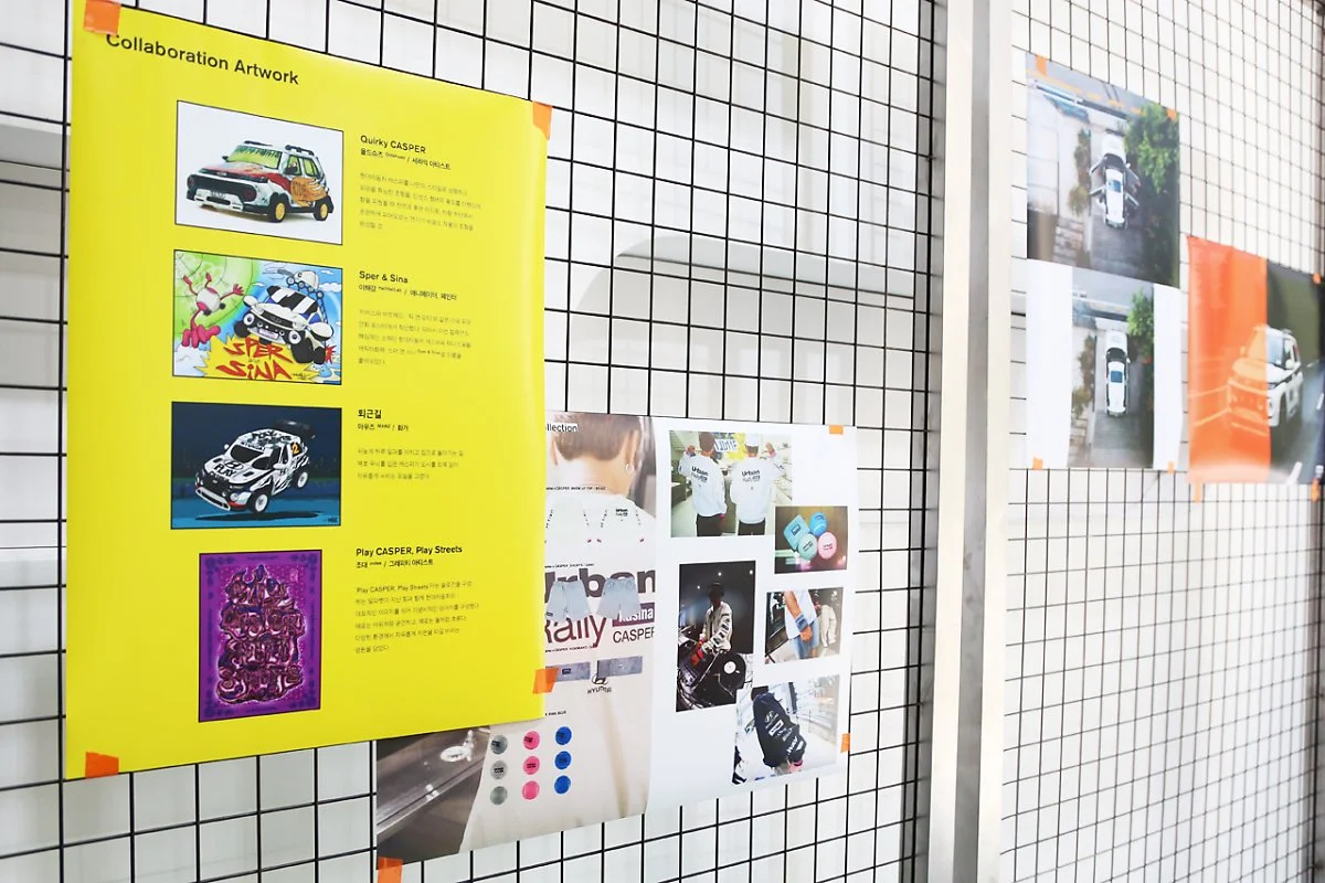 차량 주변으로는 콜라보레이션 아트워크 및 사진들도 부착되어 있었는데요. 여러 아티스트들의 작품들이 캐스퍼 스튜디오의 힙한 분위기를 한껏 높여주었습니다. 또한 커스텀 나이키와 아디다스 신발, 한정판 테니스 굿즈들이 볼거리를 제공합니다.