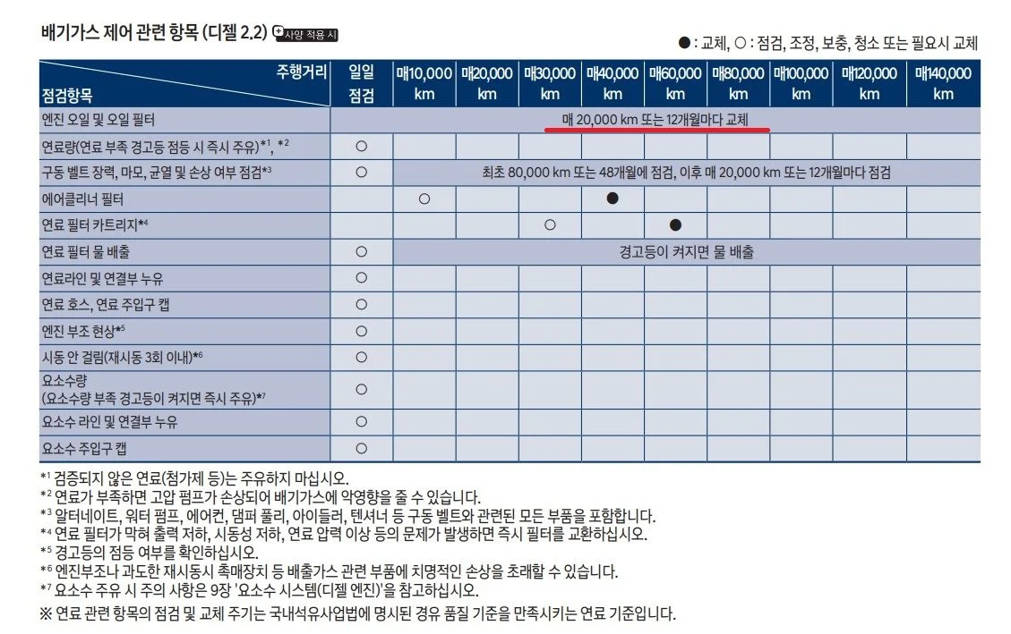 취급설명서에 따르면 스타리아 2.2 디젤 모델은 짧은 거리를 반복 주행, 비포장 주행, 잦은 고속 주행 및 급가감속 등 가혹 환경에서 주행했을 경우 매 10,000km 또는 6개월마다 교체할 것을 권장하고 있습니다. 그러나 일반적인 상황이라면 매 20,000km 또는 12개월마다 교체할 것을 권장합니다. 물론 엔진오일의 교환 주기는 엔진 종류에 따라 차이가 있기 때문에 본인의 차량 취급설명서 기준에 맞춰 교체하면 됩니다. 만약 취급 설명서를 분실했다면, 현대자동차 홈페이지에서 차종 선택 후 다운로드할 수 있습니다.
