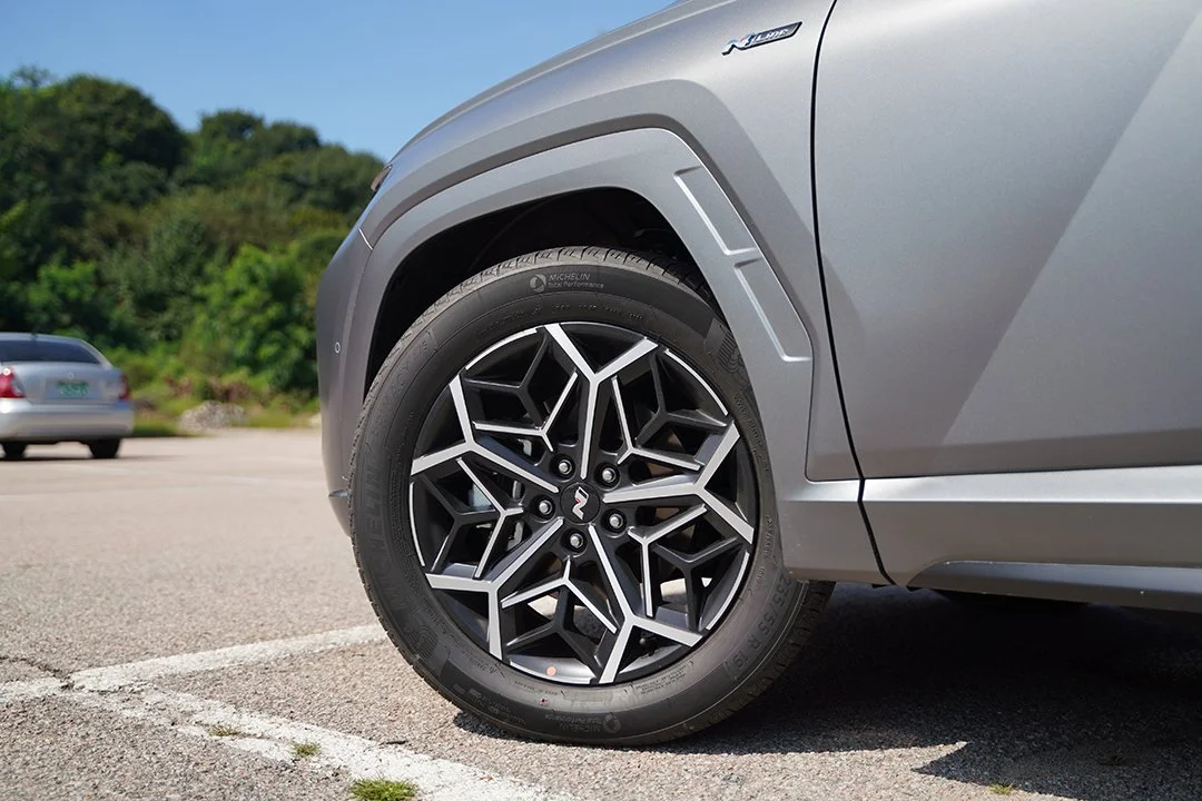 4세대 투싼은 볼륨감 있고, 각진 캐릭터 라인을 사용해 스포티한 디자인을 강조했습니다. 여기에 펜더에는 N Line 엠블럼을 부착하고, 바디 컬러 클래딩을 적용해 일체감을 더했습니다. 기하학적인 패턴의 19인치 휠과 블랙 사이드 미러 커버는 투싼 N Line의 스포티한 디자인 요소 중 하나입니다.