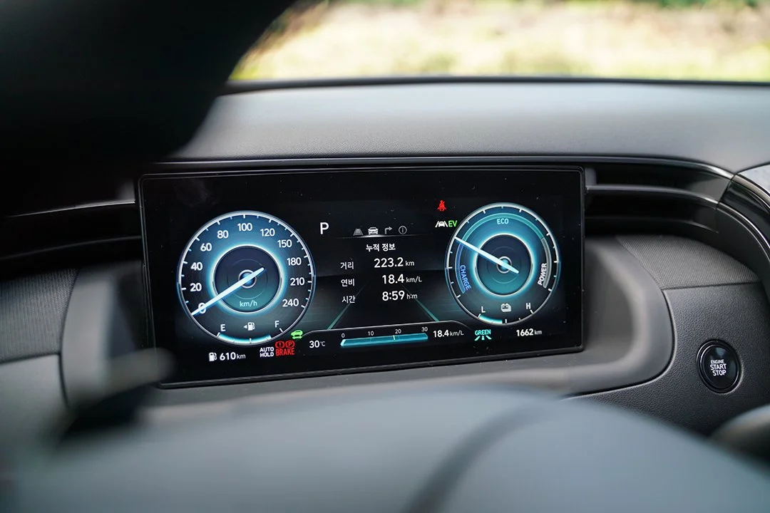 출발에 앞서 차량에 탑승 후 시동 버튼을 누르니 엔진 시동 없이 계기판 주행가능, EV 알림 등이 점등됩니다. 시승차인 투싼 N Line 하이브리드는 최고출력 180마력, 최대토크 27kg.m를 발휘하는 스마트스트림 1.6 가솔린 터보엔진과 최고출력 44.2kW, 최대토크 264Nm를 발휘하는 전기모터가 더해져 시스템 최고출력 230마력을 발휘합니다. 공인 복합연비는 빌트인 캠 사양이 더해진 모델 기준 15.3km/L로 하이브리드 모델답게 뛰어난 연비를 자랑합니다.