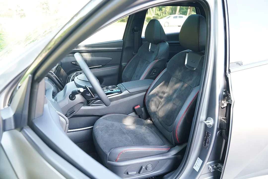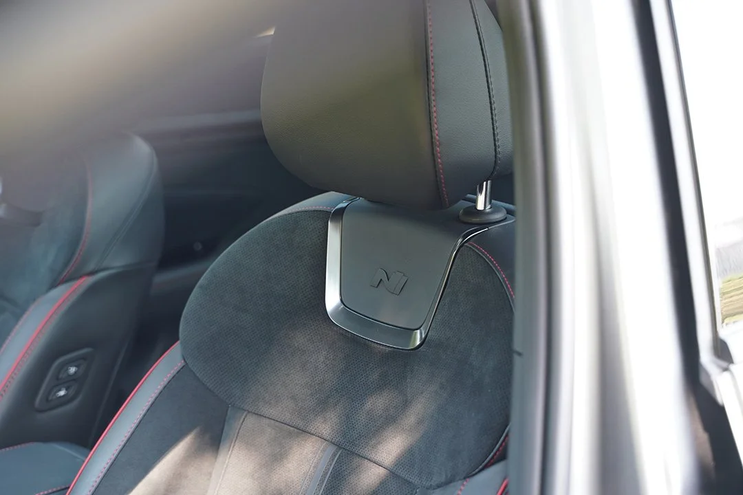 시트 역시 N 브랜드의 감성을 느낄 수 있는 요소 중 하나입니다. 블랙 스웨이드가 적용된 가죽시트에도 붉은색 스티치를 적용했으며, 헤드레스트 하단에는 N 로고와 이를 감싸는 무광 크롬 색상의 가니쉬를 적용했습니다.