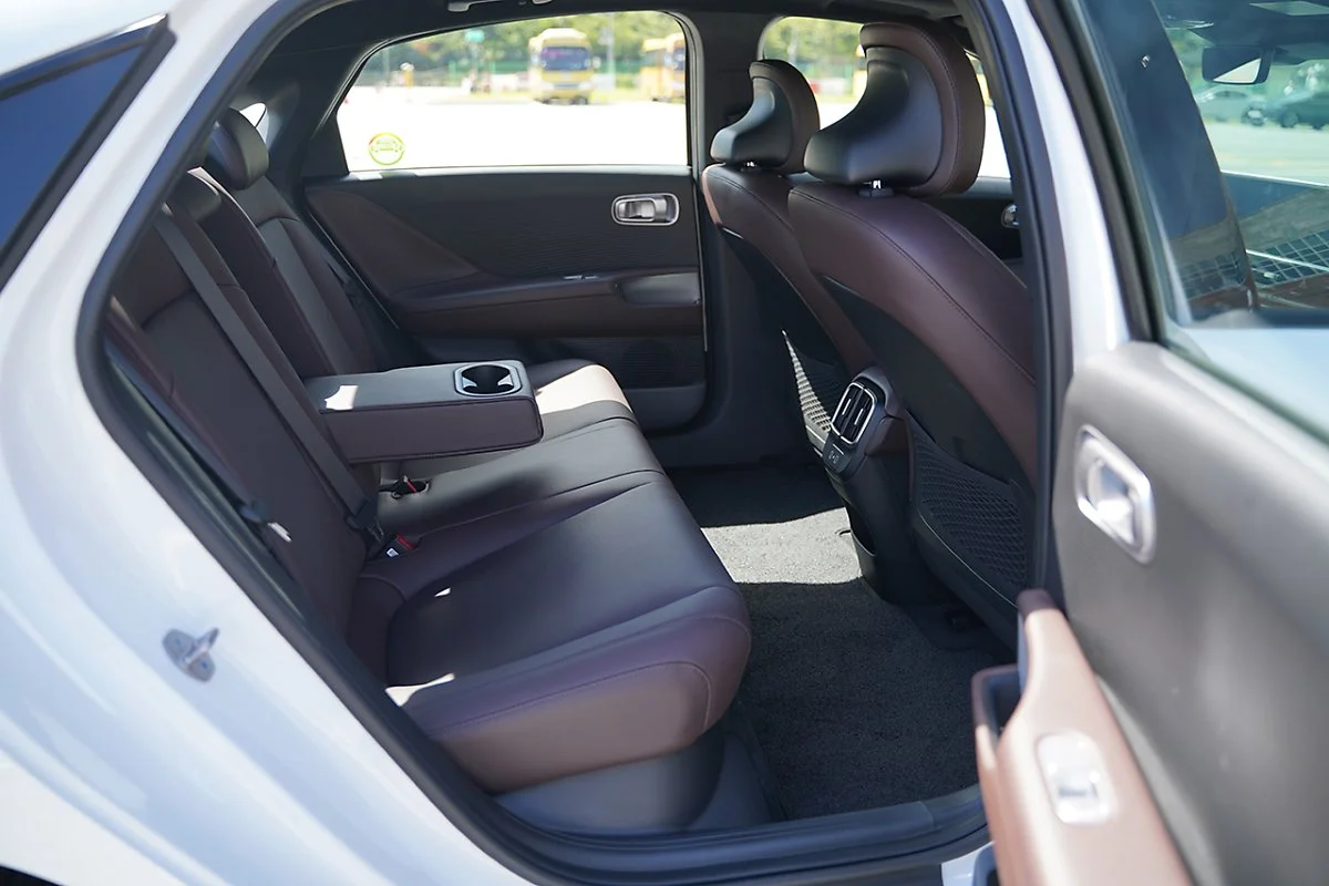 2열은 넉넉한 공간이 매력입니다. 유선형 디자인을 적용한 세단 전기차지만, 광활한 레그룸 덕분에 2열 공간은 더욱 여유롭게 느껴집니다. 또한 E-GMP 기반의 평평한 바닥 덕분에 가운데 자리도 불편함 없이 탑승할 수 있습니다.