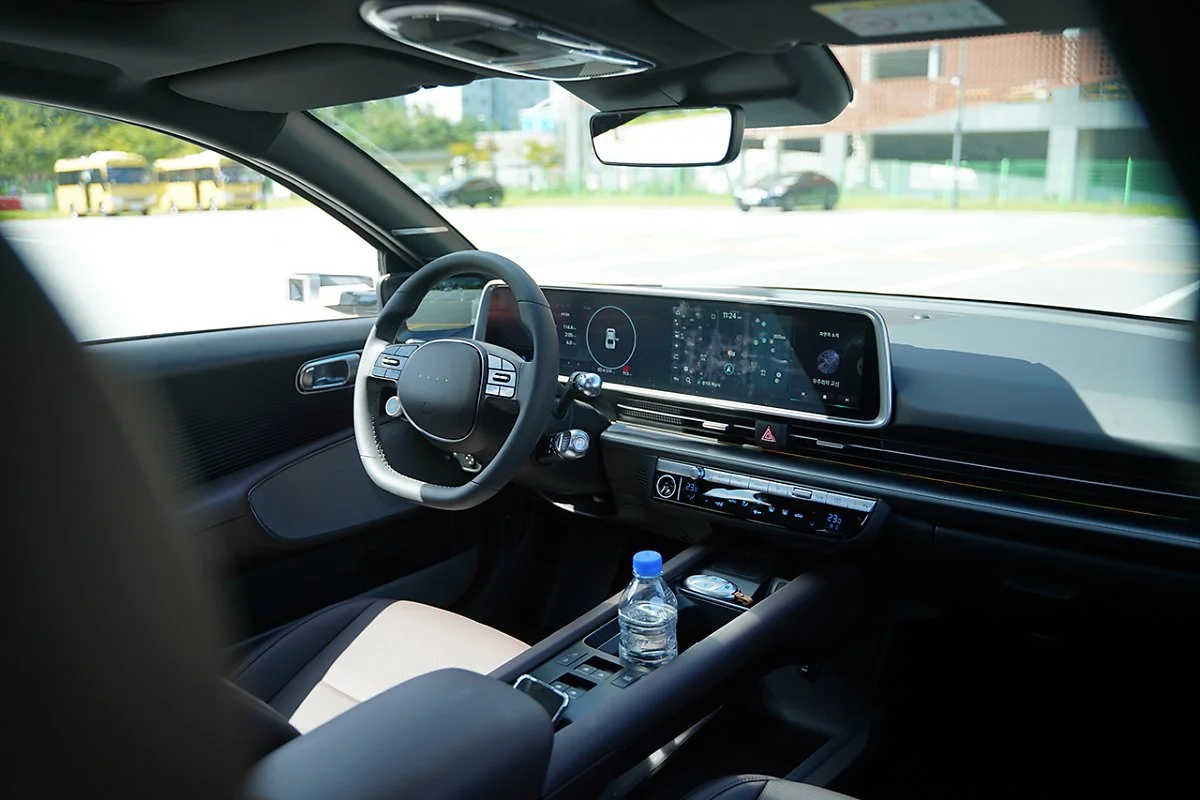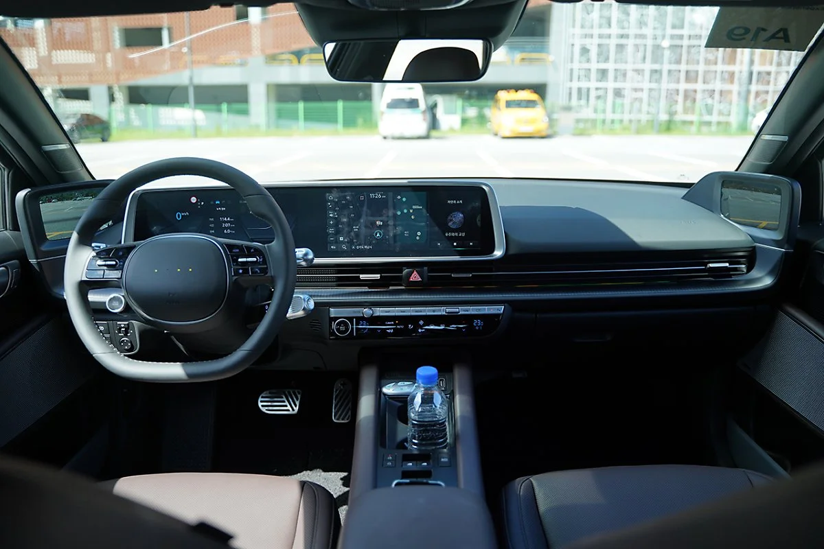 아이오닉 6의 실내는 E-GMP를 기반으로 여유로운 공간을 제공하는 동시에 운전자를 위한 공간으로 디자인되었습니다. 아이오닉 5와 달리 운전석과 동승석을 나누는 긴 브릿지 타입 콘솔을 적용해 안락한 느낌을 주는 동시에 콘솔 하단에는 넉넉한 수납공간을 마련했습니다. 또한 비행기 날개의 윙렛에서 영감을 받은 디지털 사이드 미러 디스플레이는 디자인적으로 우수하다고 느껴질 뿐만 아니라 운전 중 시선 이동을 최소화할 수 있었습니다.