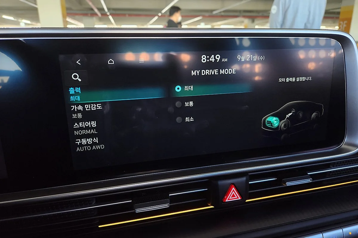 또한 현대차그룹 최초로 적용된 EV 성능 튠업은 아이오닉 6를 취향에 따라 다양하게 세팅할 수 있습니다. 조절 가능한 범위는 출력(3단계), 가속민감도(3단계), 스티어링(2단계), 4륜 구동방식(3단계)로 조절 정도에 따라 직관적으로 느껴질 만큼 큰 변화가 있는 것이 매력적입니다. 특히 후륜 고정모드를 선택할 경우 주행거리를 약 30% 정도 더 확보할 수 있어 배터리 잔량 등 상황에 맞춰 다양하게 활용할 수 있습니다. 또한 후륜 고정모드를 선택하더라도 전륜모터의 회생제동 기능은 지속적으로 작동하기 때문에 효율 측면에서 매우 우수합니다.