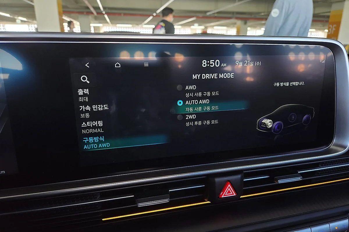 스티어링 감도는 스티어링 조작 감도를 조절합니다. 일반적인 환경이라면 노말 모드를 추천하고, 보다 스포티한 주행을 원할 때에는 스티어링 감도가 무거워지고, 직관적인 스포츠 모드를 사용하면 좋습니다. 마지막으로 4륜 구동방식은 AWD(상시 사륜구동), AUTO AWD(자동 사륜구동), 2WD(상시 후륜구동) 중 선택할 수 있습니다.