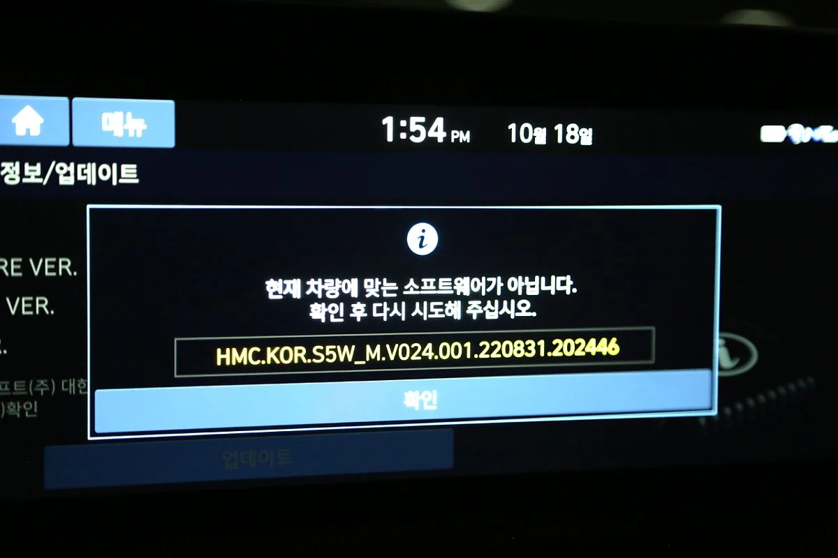 하지만 차량 출고 후, 오랫동안 내비게이션 업데이트를 하지 않았다면 주의가 필요합니다. 중간 업데이트가 필요하거든요. 예를 들어서 2019년 내비게이션 경우, 2021년 필수 업데이트를 하지 않으면, 2022년 버전의 업데이트를 진행할 수 없습니다. 이 때는 위와 같은 ‘현재 차량에 맞는 소프트웨어가 아닙니다’라는 문구가 표시됩니다.