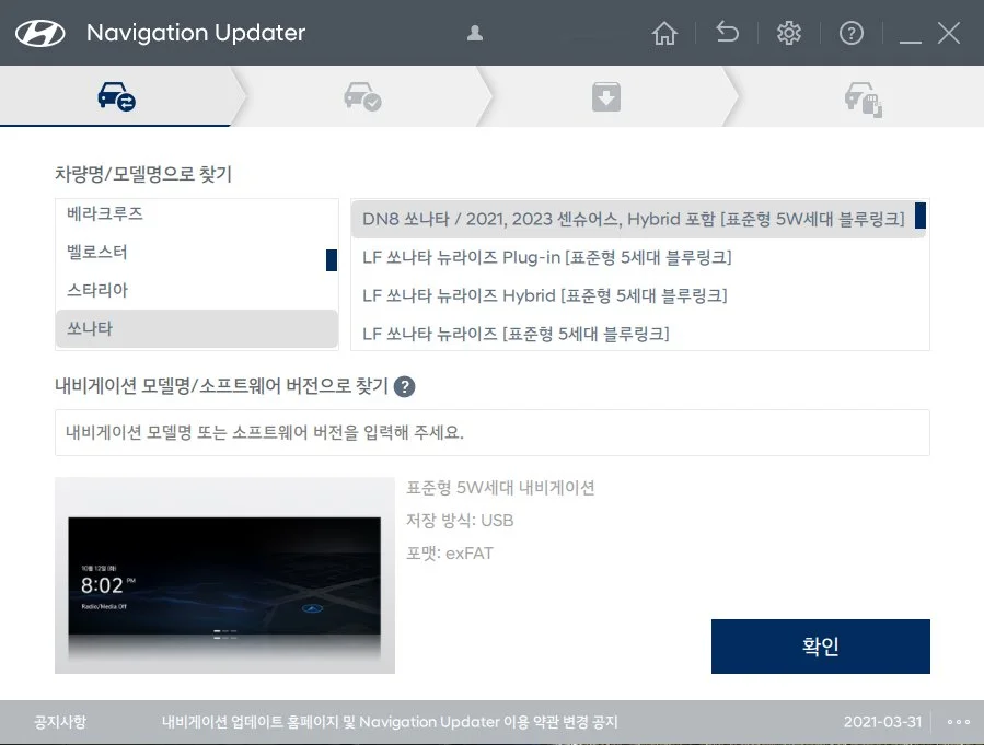 내비게이션 업데이트를 위해서는 PC 인터넷 검색창에 ‘현대자동차 내비게이션 업데이트’를 검색하면 관련 사이트가 뜹니다. 해당 사이트에서는 내비게이션 업데이터 파일을 다운로드해 주시면 됩니다. 그리고 차종과 소프트웨어 버전을 찾아주세요. 검색과 목록 선택 모두 가능합니다.
