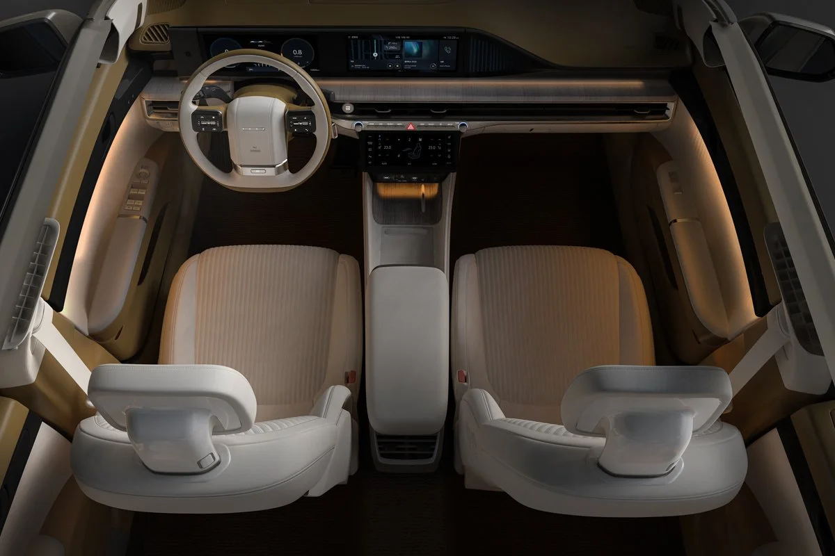 실내 공간에서는 원스포크 디자인 스티어링 휠의 오마주와 최첨단 이미지를 나타내는 디지털 디스플레이가 대표적입니다. 그리고 아늑함을 배가시키는 복고풍 패턴의 앰비언트 라이팅도 빼놓을 수 없죠.