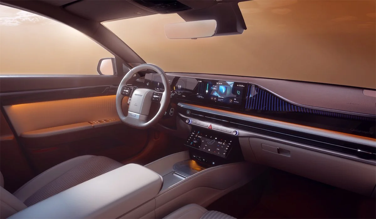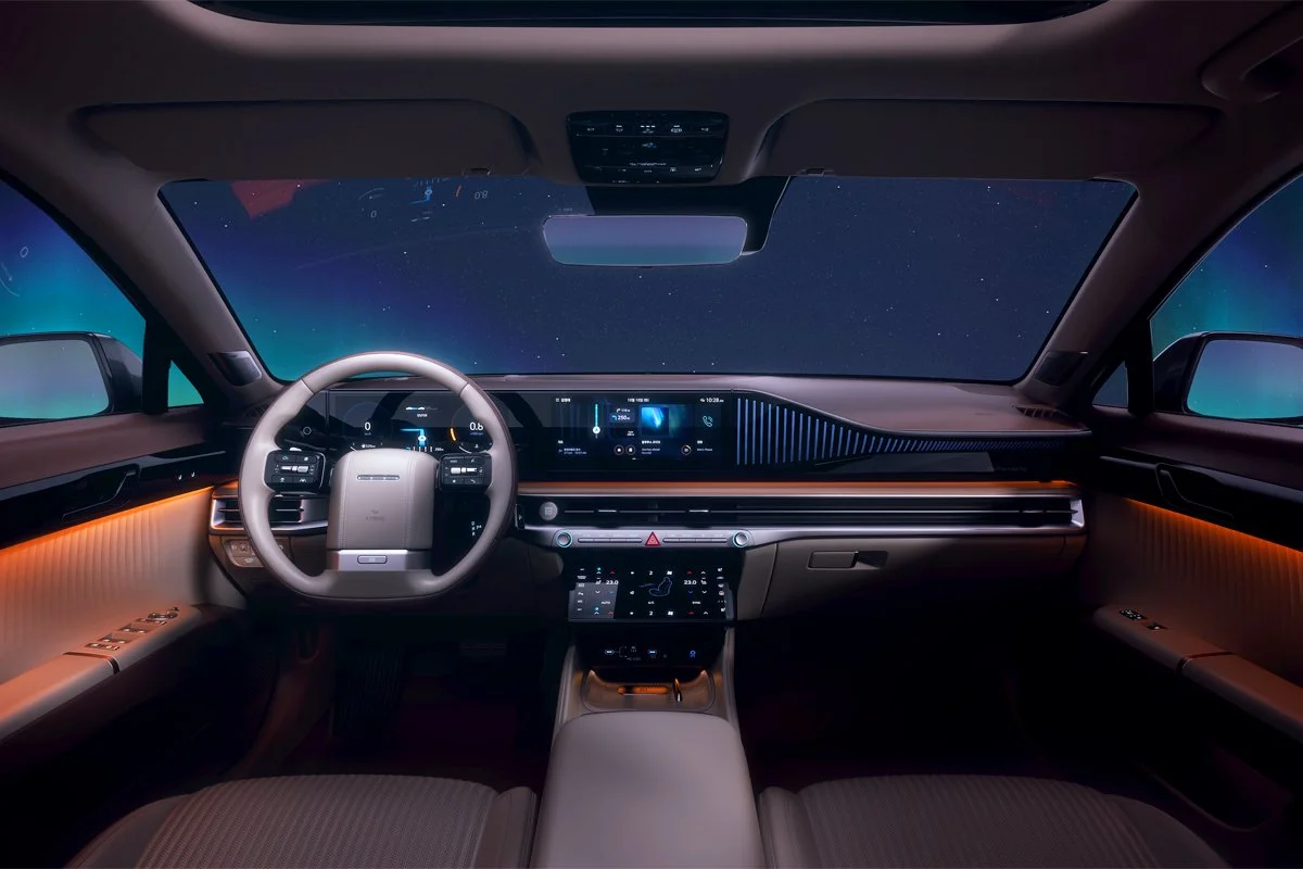 실내 공간에서 가장 최신 트렌드에 어울리는 요소는 바로 디지털 디스플레이입니다. 디지털 클러스터와 인포테인먼트 디스플레이를 포함하는 하우징 패널이 대시보드 끝과 끝을 장식하며 넓은 실내 공간을 강조합니다. 여기에 복고풍의 앰비언트 라이팅 패턴이 더해져 아늑한 공간을 만들어내죠. 결과적으로 그랜저의 실내 디자인은 복고와 첨단이라는 두 키워드가 만나 구성된 새로운 공간감을 제공합니다.