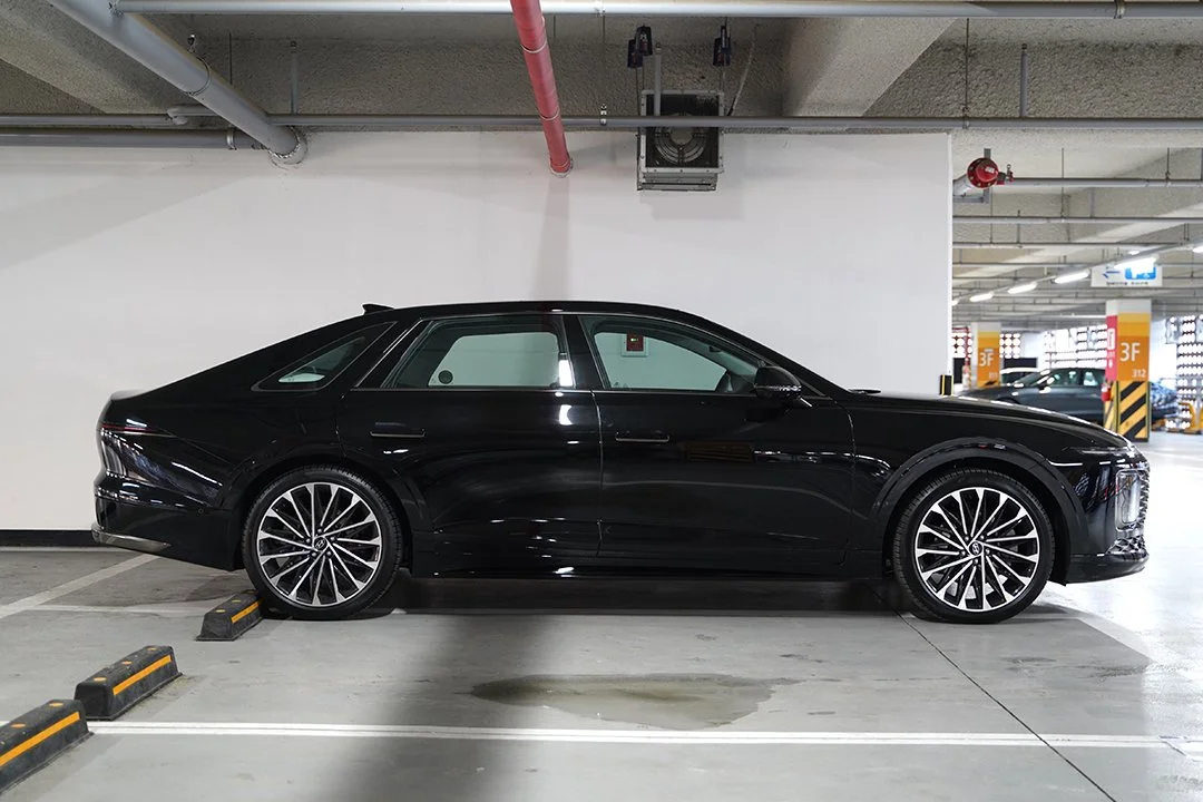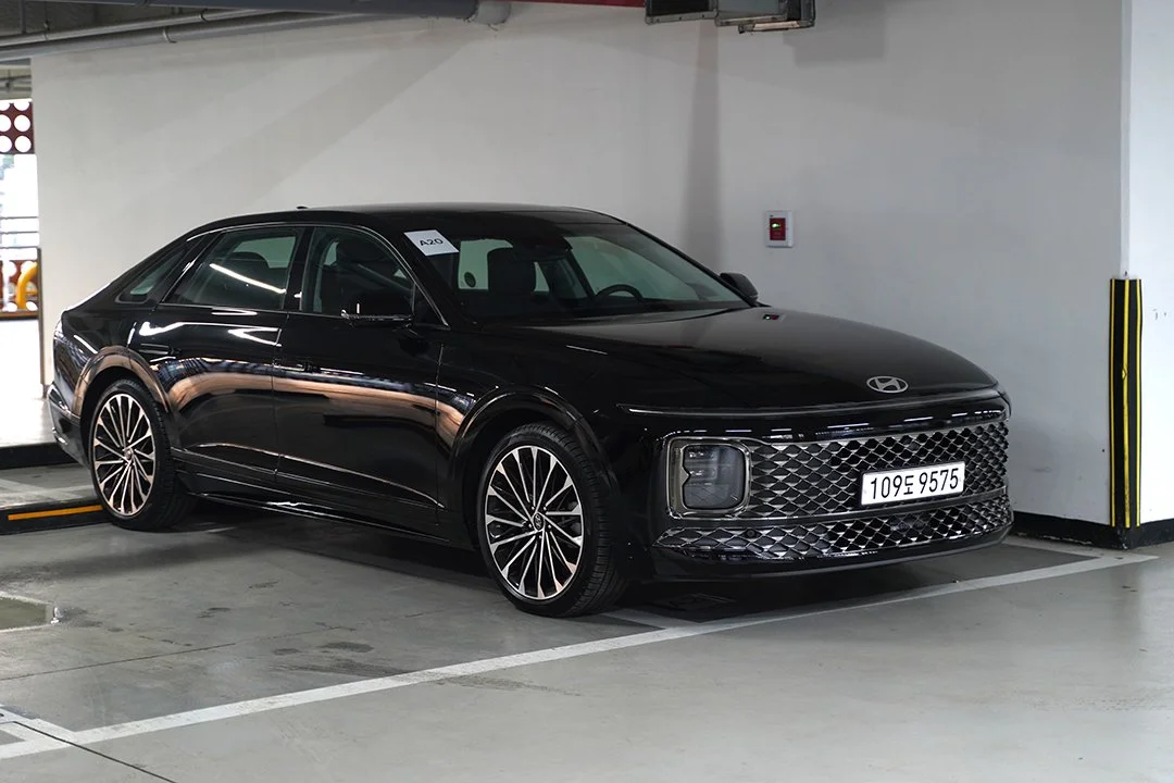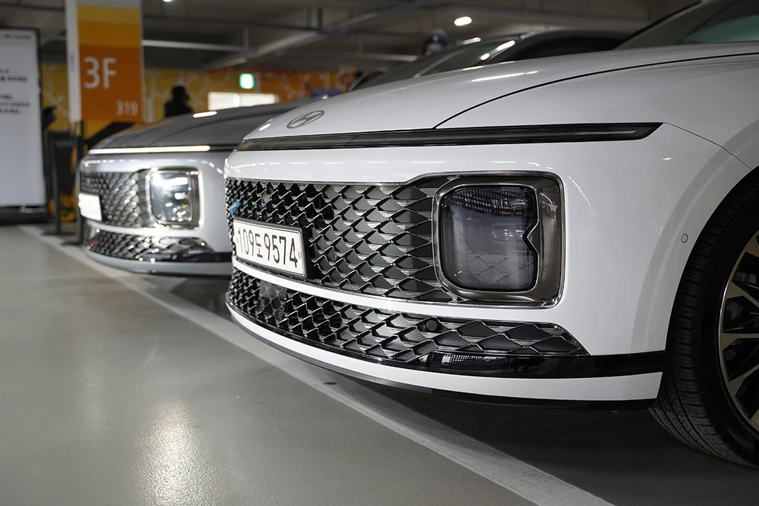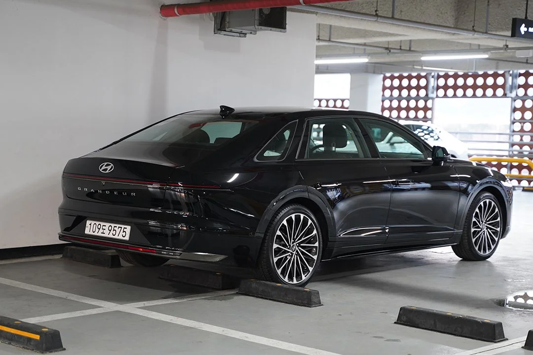 전시장이 아닌 일반 주차장에서 마주친 디 올 뉴 그랜저는 5m가 넘는 전장에 압도감이 느껴졌습니다. 또한 세련미를 더하는 수평형 주간주행등, 볼륨감이 느껴지는 펜더 라인, 캘리그래피 전용 20인치 휠 등 플래그십 세단의 위엄과 미래지향적인 이미지가 적절히 어우러진 모습이 시선을 사로잡았습니다.