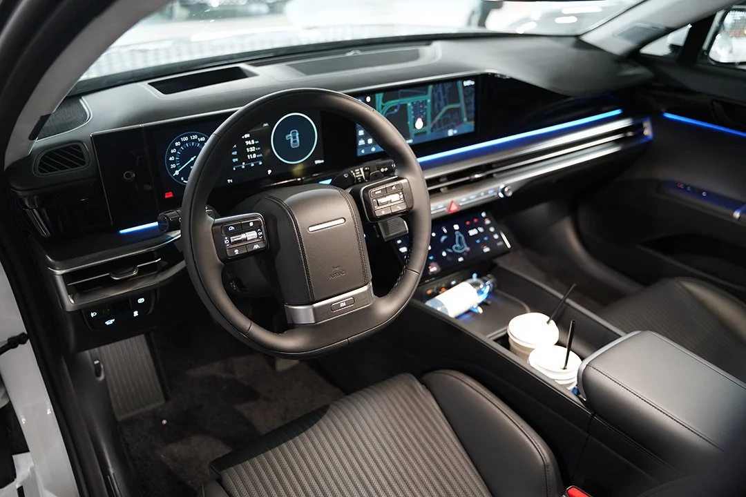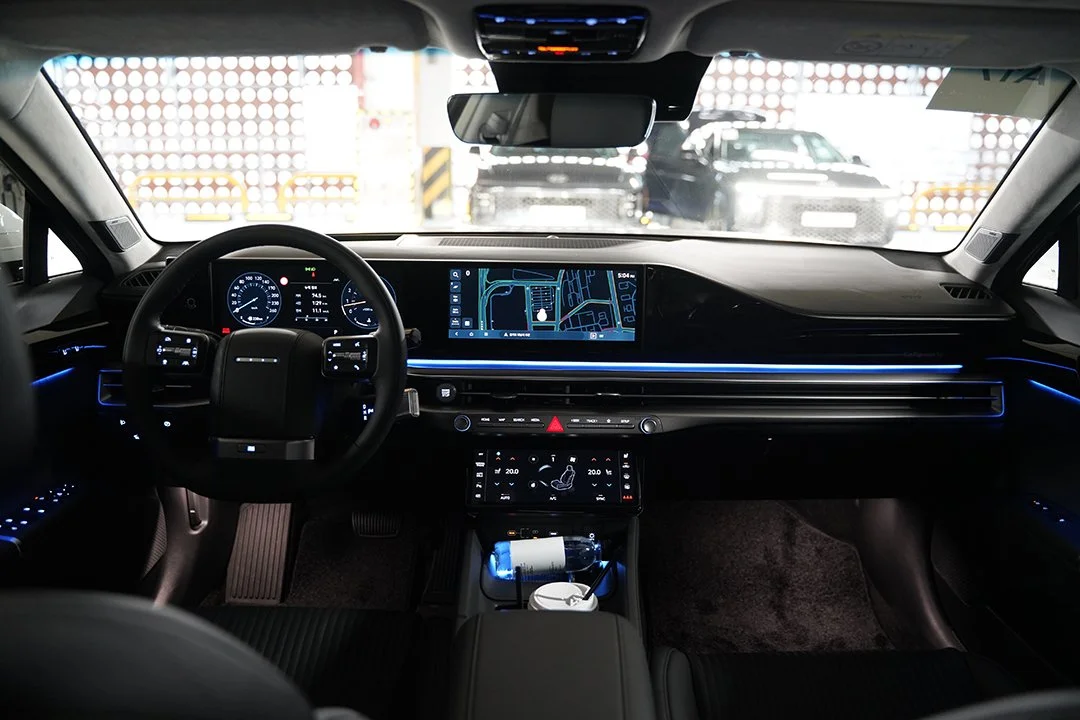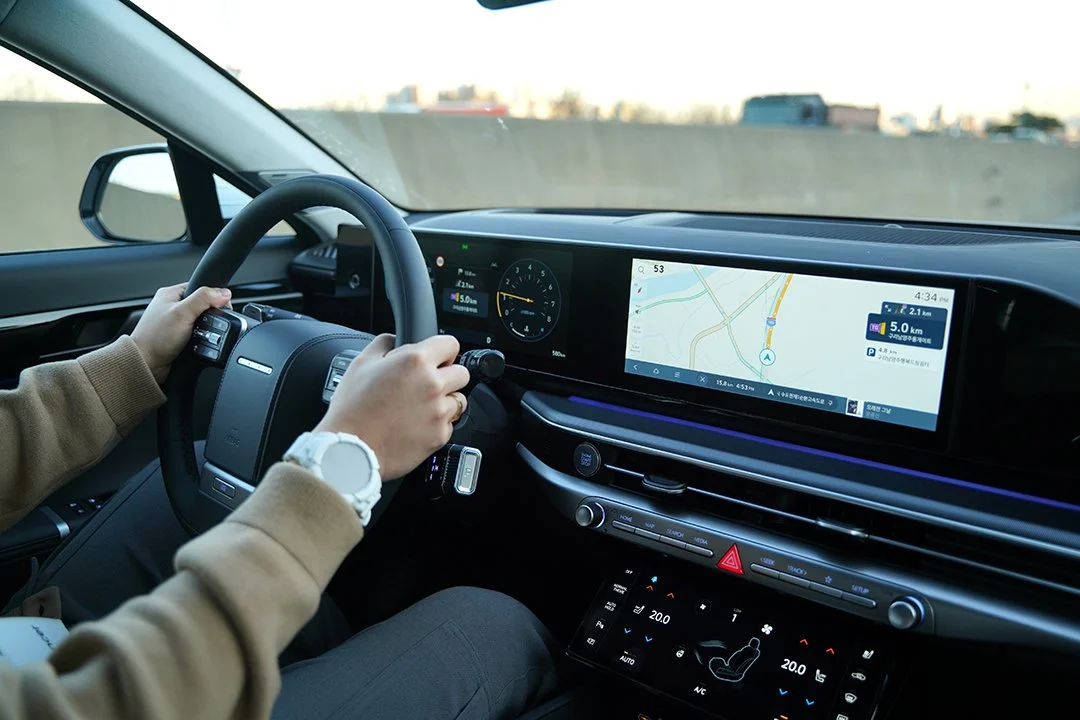 시승을 위해 차량에 탑승 후 시동 버튼을 누르면 실내로 부드럽게 유입되는 엔진음과 함께 시동이 걸립니다. 12.3인치 디스플레이가 나란히 적용된 디지털 클러스터와 인포테인먼트 디스플레이는 기존 그랜저와 같은 구성인데, 최신 그래픽이 적용되어 색다른 느낌을 줍니다. 또한 1세대 그랜저가 떠오르는 스티어링 휠은 디 올 뉴 그랜저만의 개성 있는 실내 분위기를 완성합니다.