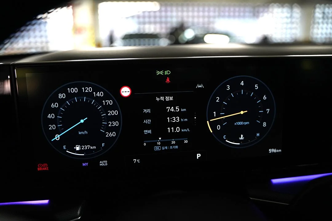 약 75km/L의 거리를 시승한 후 확인한 디 올 뉴 그랜저의 연비는 11km/L였습니다. 고속 주행 환경이 많았지만, 트래픽이 많았고, 시승 중 급가감속이 잦았던 것을 고려하면 매우 좋은 결과였습니다. 참고로 디 올 뉴 그랜저 3.5리터 가솔린 AWD 모델의 공인연비는 복합 9km/L(20인치 휠)입니다.