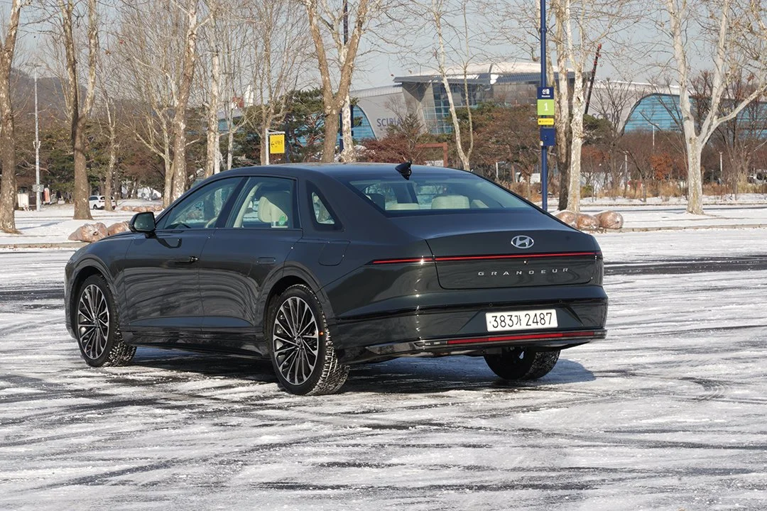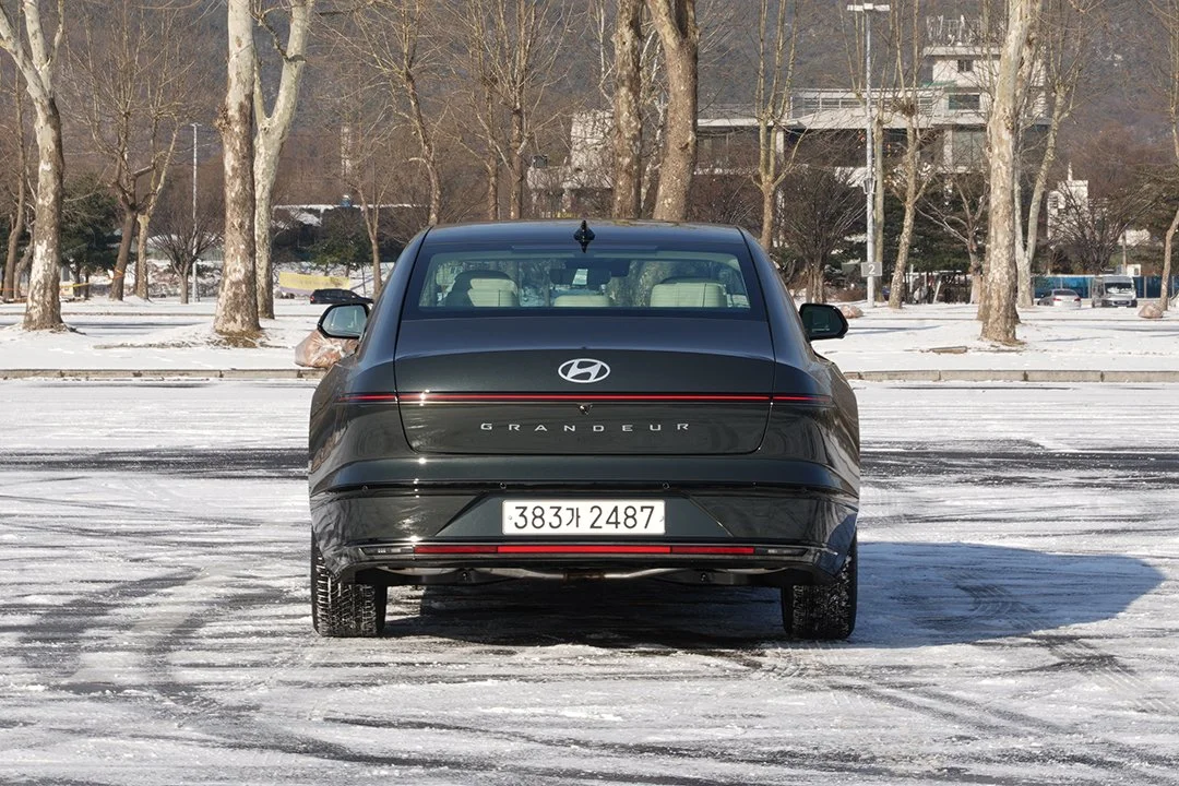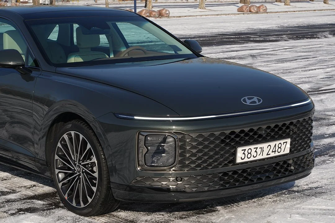 시승차는 디 올 뉴 그랜저 하이브리드 캘리그래피 모델로 세미 글로시 티탄 룩 컬러로 마감된 라디에이터 그릴과 헤드램프 가니쉬가 적용됐습니다. 특히 신형 그랜저 하이브리드는 내연기관 모델과 휠을 포함한 모든 외관 디자인이 동일합니다. 덕분에 외관 디자인만 보고 하이브리드 모델인지는 쉽게 알아차리기 어려운 것이 특징입니다.