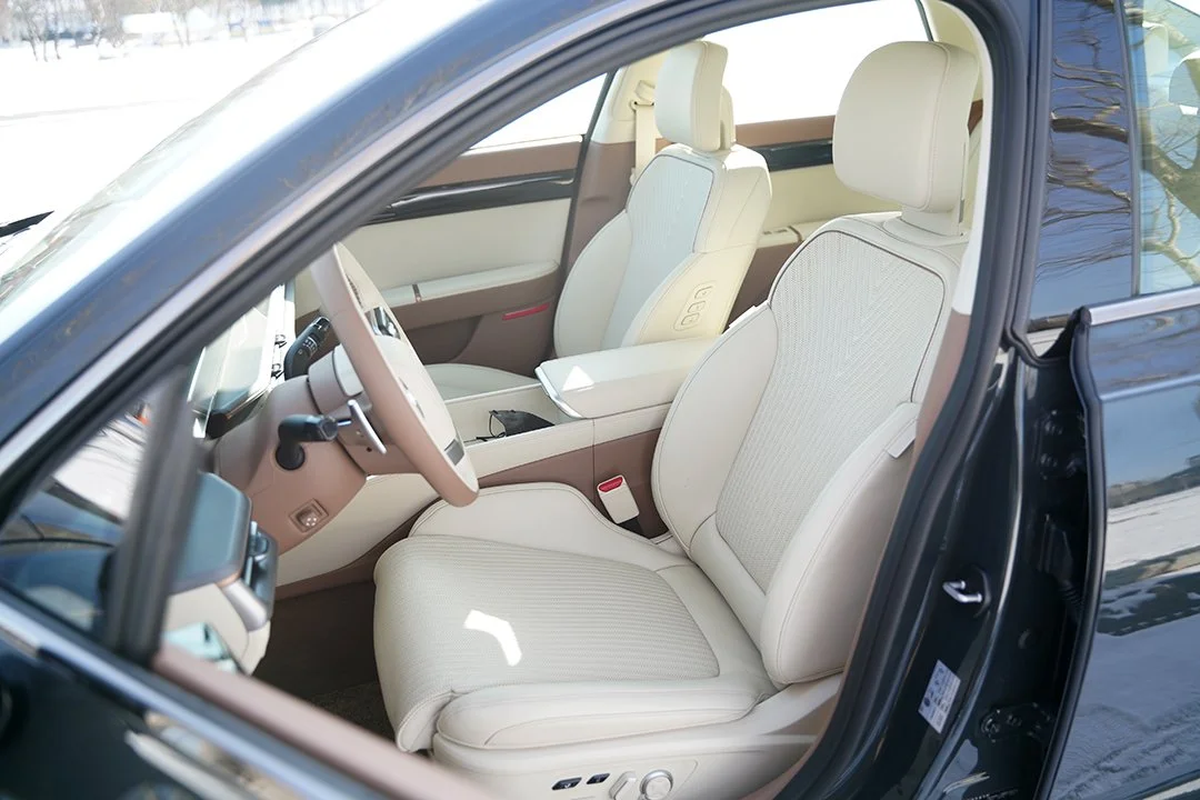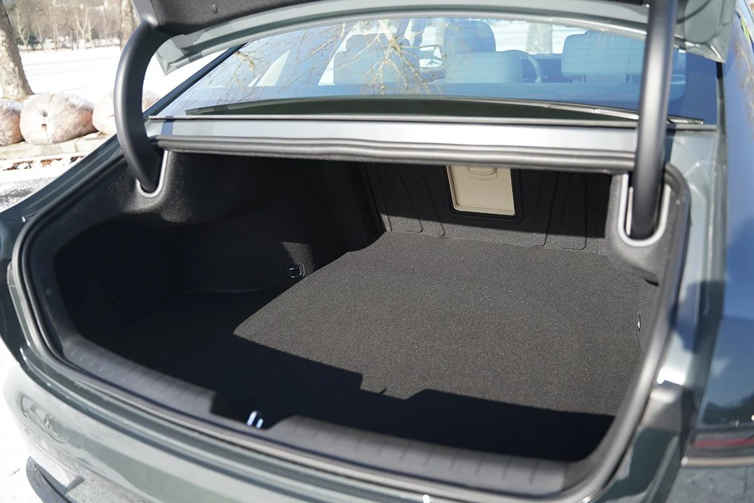 2열의 넉넉한 레그룸은 전륜구동 기반 대형 세단의 장점을 바로 느낄 수 있는 요소 중 하나입니다. 하이브리드 모델은 고전압 배터리가 시트 하단에 적용되며, 리클라이닝 시트가 제외되었습니다. 대신 기본 시트 등받이 각도 세팅이 약간 누운 형태로 편안한 탑승이 가능합니다. 덕분에 머리 공간도 제법 여유로운 편이며, 전동식 선 블라인드 사양이 적용되어 2열 탑승객의 편의성을 높였습니다.