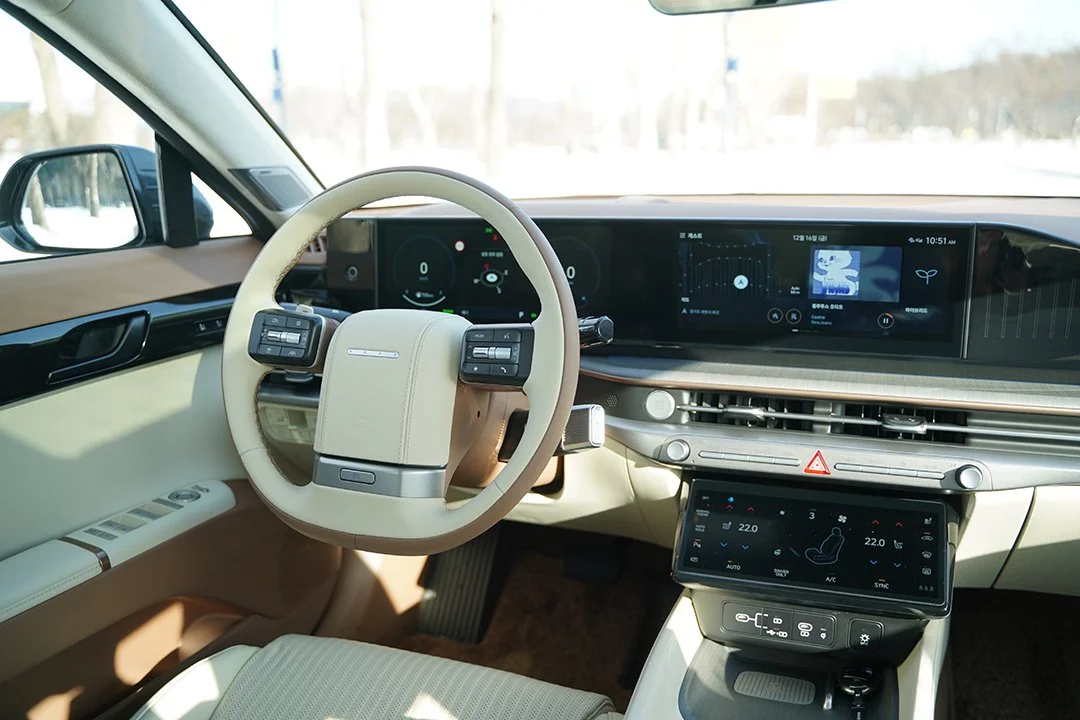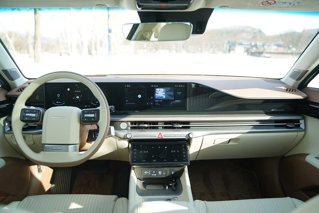 실내는 12.3인치 디스플레이가 나란히 적용된 듀얼 디스플레이 레이아웃을 사용했고, 10.25인치 풀 터치 공조 컨트롤러까지 적용되어 하이테크한 느낌을 줍니다. 계기판은 하이브리드 모델임을 알 수 있는 파워 게이지가 우측에 적용되며, 취향에 따라 RPM 게이지로 변경할 수 있도록 했습니다.