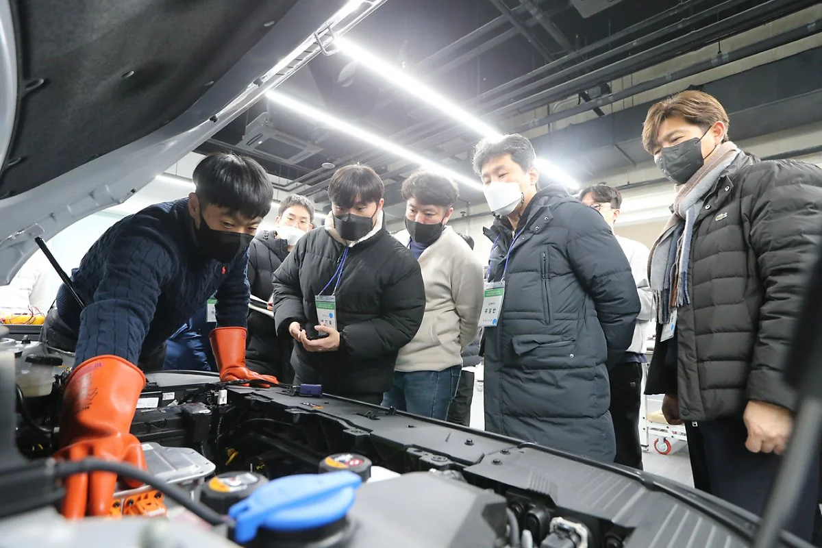 지상 1층의 전기차 전용 교육장은 바닥을 비롯해서 절연소재로 마감이 되어 있습니다. 이곳에서는 전기차의 배터리 셀과 전기차의 하부를 모두 확인할 수 있기 때문에 전기차의 구조와 원리부터 정비까지 전기차와 관련된 모든 교육 진행이 가능합니다. 특히 소방관들도 전기차 화재 시 대처를 어떻게 해야 하는지 알아야 하기 때문에 관련 기관에 대한 전기차 교육도 바로 이곳에서 진행하고 있습니다.