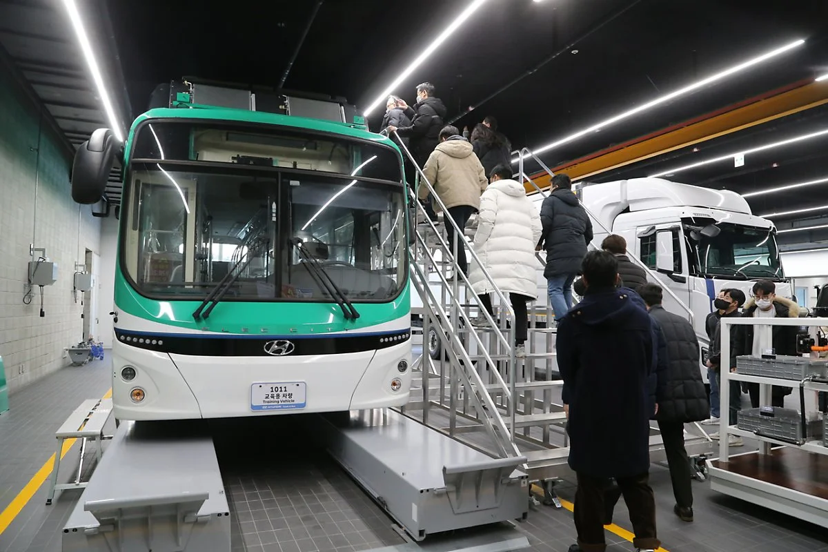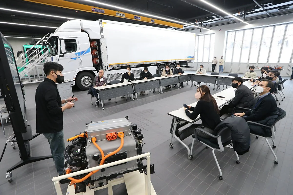 특히 지하 1층 상용차 교육장에서는 전기버스인 일렉시티와 국내 수소전기트럭 1호차인 엑시언트 퓨얼셀도 볼 수 있었는데요. 유럽에 수출하는 차량과 같은 모델로, 수소전기트럭 기술에 대한 교육 진행도 함께 이뤄져서 기자단의 큰 관심을 받았습니다.