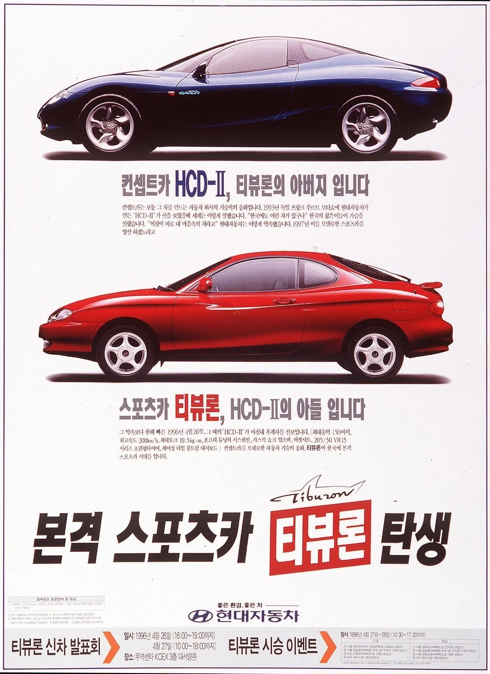 티뷰론은 1996년 출시돼 2001년까지 생산된 스포츠 루킹카입니다. 곡면의 근육질 디자인이 돋보이는 차량으로 당시 젊은 층에게 선풍적인 인기를 끌었던 차량입니다. 티뷰론은 캘리포니아 디자인 센터에서 디자인한 HCD-1과 HCD-2 콘셉트카의 디자인을 이어받은 차량입니다.