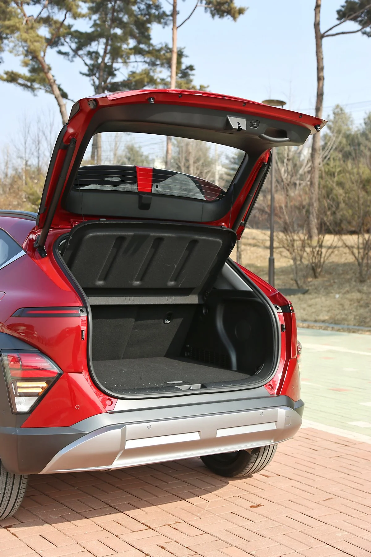 트렁크는 제가 할 말이 더 많은데요. 1세대 코나 트렁크는 566리터로 라면박스 두세 개만 넣어도 가득 찼습니다. 마트에서 애들 데리고 장 보려면 정말 그렇게 힘들 수가 없었죠. 그런데 이제는 723리터라고요? 이 정도면 훌륭합니다. 더 클 필요도 없어요. 트렁크가 723리터로 커지니까. 열리는 높이도 상당하고, 그래서인지 전동식 개폐 버튼이 추가되었는데, 아주 편리하고 좋아요. 바닥 면도 낮출 수 있고, 그 안쪽으로도 물건 보관이 용이한데다, 좌우로 쇼핑백도 걸어둘 수 있다는 점이 1세대 대비 디테일해졌네요.