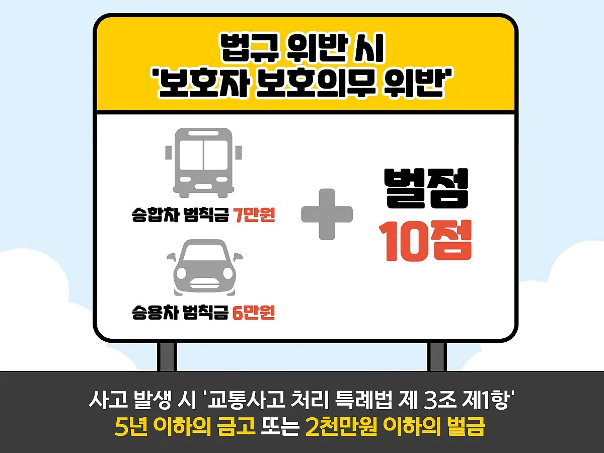 횡단보도에 사람이 없고, 우회전 신호가 없어도 무조건 일시정지를 해야하는 구간이 있습니다. 바로 어린이보호구역입니다. 어린이보호구역에서는 일반 도로와 달리 무조건 일시 정지 의무를 준수해야 합니다. 만약 이를 지키지 않을 경우에는 '보호자 보호의무 위반'으로 처벌 대상이 될 수 있습니다.