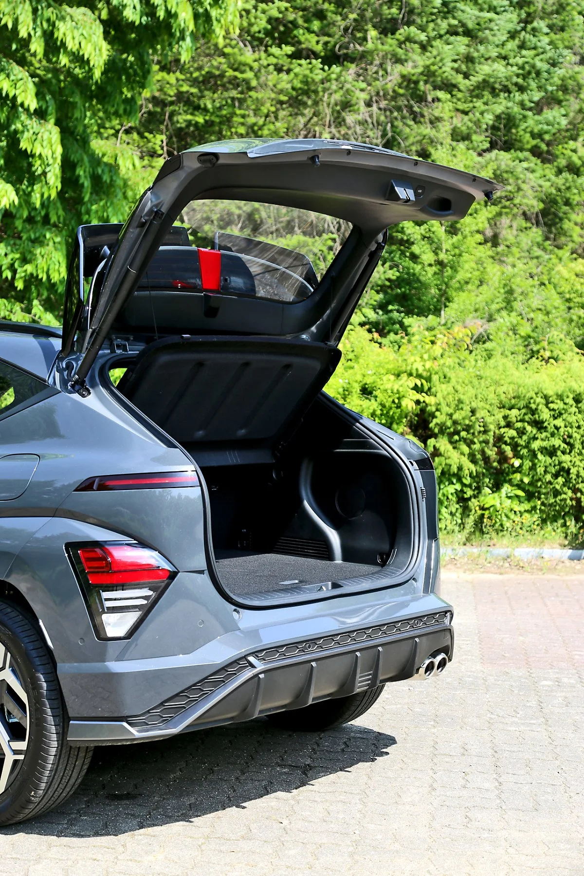 후면부 역시 시선을 사로잡습니다. 수평형 테일램프와 윙 타입 리어 스포일러는 현대자동차 SUV 중 가장 독특하고 공격적인 형태라고 봐도 무방합니다. 모르는 사람이 보면 원래 달려 나온 부품이 맞나 생각할 정도입니다. 범퍼 역시 한껏 멋을 낸 디퓨저와 싱글 트윈 팁 머플러로 고성능 감성을 크게 끌어올린 것이 특징입니다.