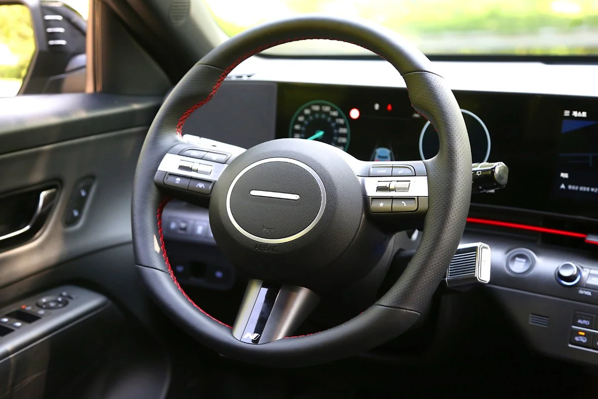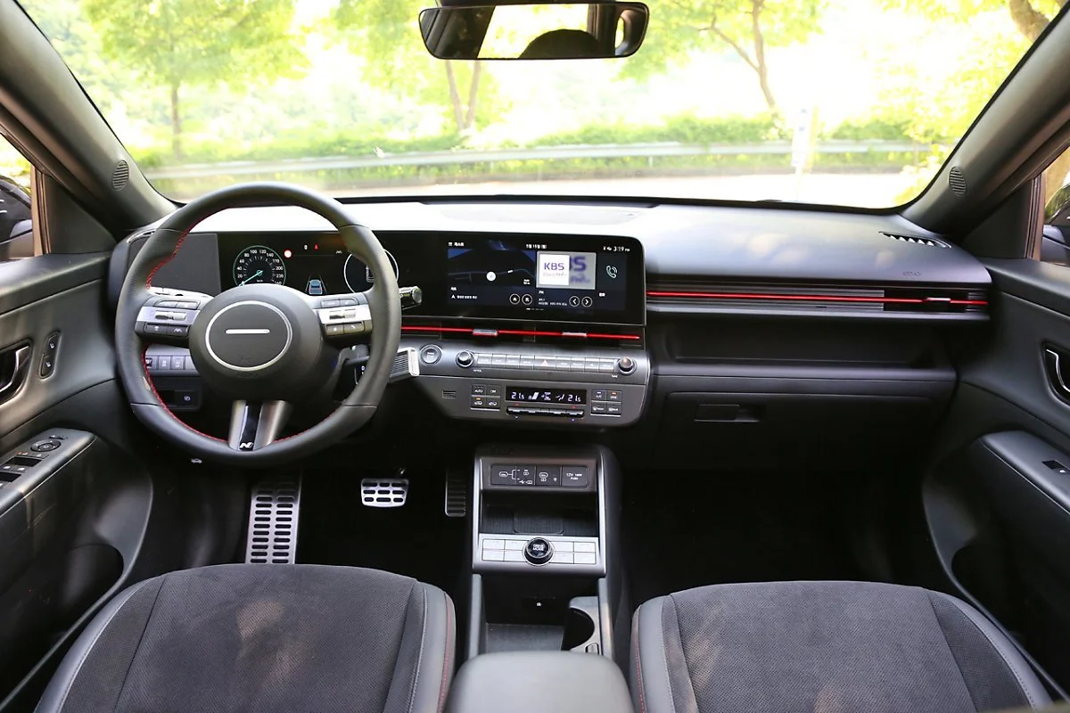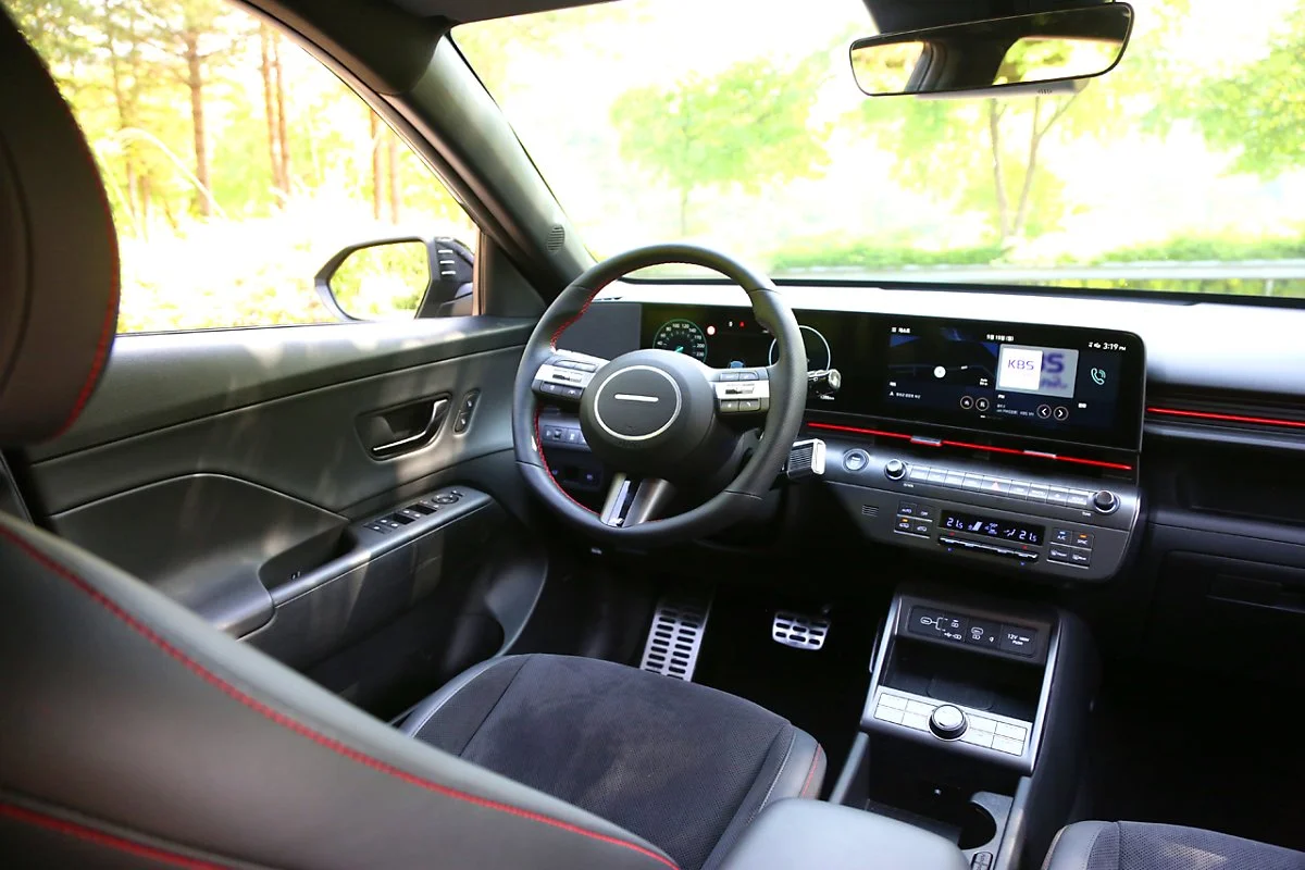 실내는 작지만 확실한 변화를 줬습니다. 스티어링 휠 6시 방향에는 N 로고를 넣어 확실한 존재감을 부여했고, 레드 스티치와 송풍구 라인을 빨간색으로 처리했습니다. 시트는 천연가죽과 알칸타라 소재를 복합적으로 활용한 것이 특징입니다. 마찬가지로 레드 포인트와 스티치, N 로고가 들어갔습니다. 페달과 도어 스카프에는 메탈 소재를 더해 스포티한 감성을 강조했습니다.