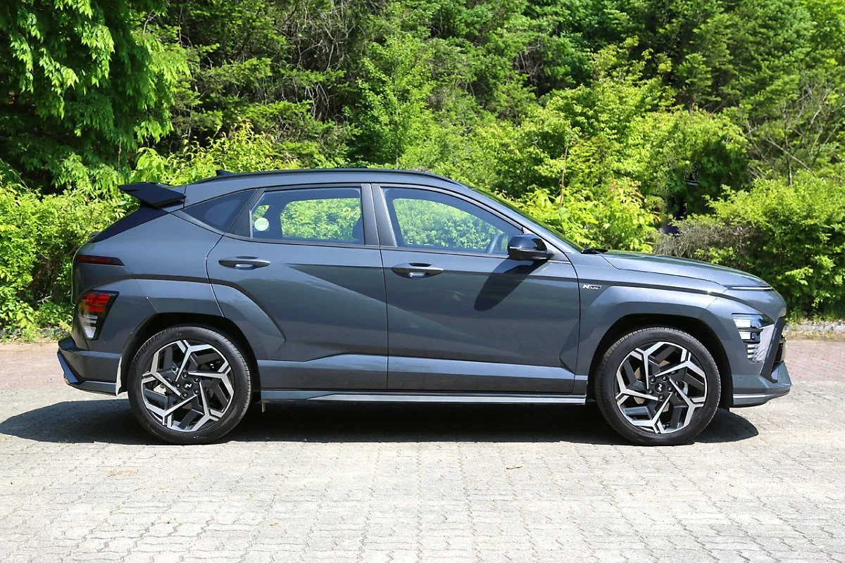 측면 디자인은 차체가 기존보다 커 보이면서도 살짝 낮다는 느낌을 들게 합니다. 기존 디 올 뉴 코나에서는 무광 블랙으로 구성했던 펜더 플레어가 차체 색상과 동일하게 구성됐기 때문이 아닐까 합니다. 하지만 이 부분이 오히려 SUV의 단단함과 스포츠 모델로써의 세련미를 함께 부각시켜줍니다. 블랙 사이드미러 커버와 N Line 전용 19인치 휠도 역동적인 이미지를 배가시켜줍니다.