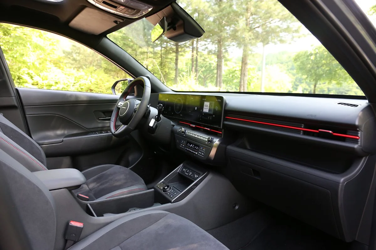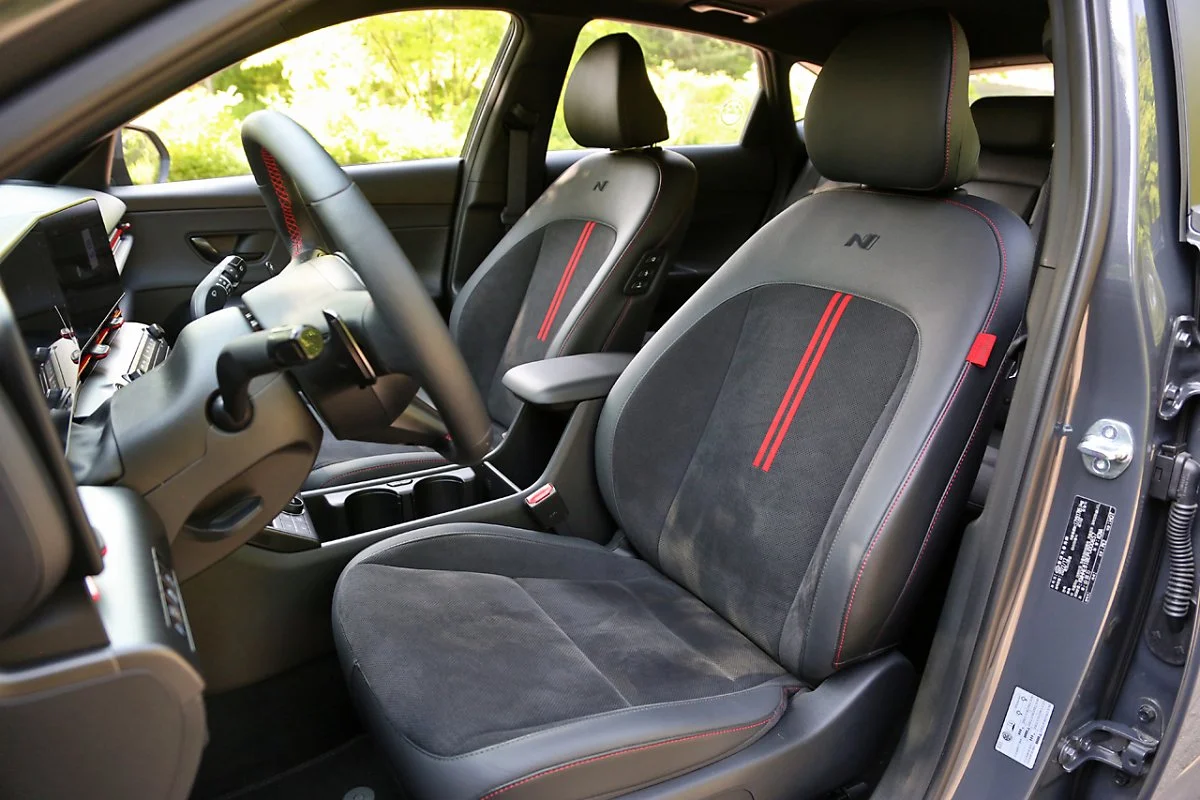 N Line 특유의 고성능의 감성은 실내에서도 충분히 누릴 수 있습니다. 레드 컬러 포인트가 송풍구를 가로지르며, 시트와 스티어링 휠, 시트 등에 스티치로 삽입됩니다. 천장과 내부 도어 핸들 등의 세부 요소들은 모두 블랙으로 처리해서 레드 컬러 포인트와 대비를 극대화했습니다.