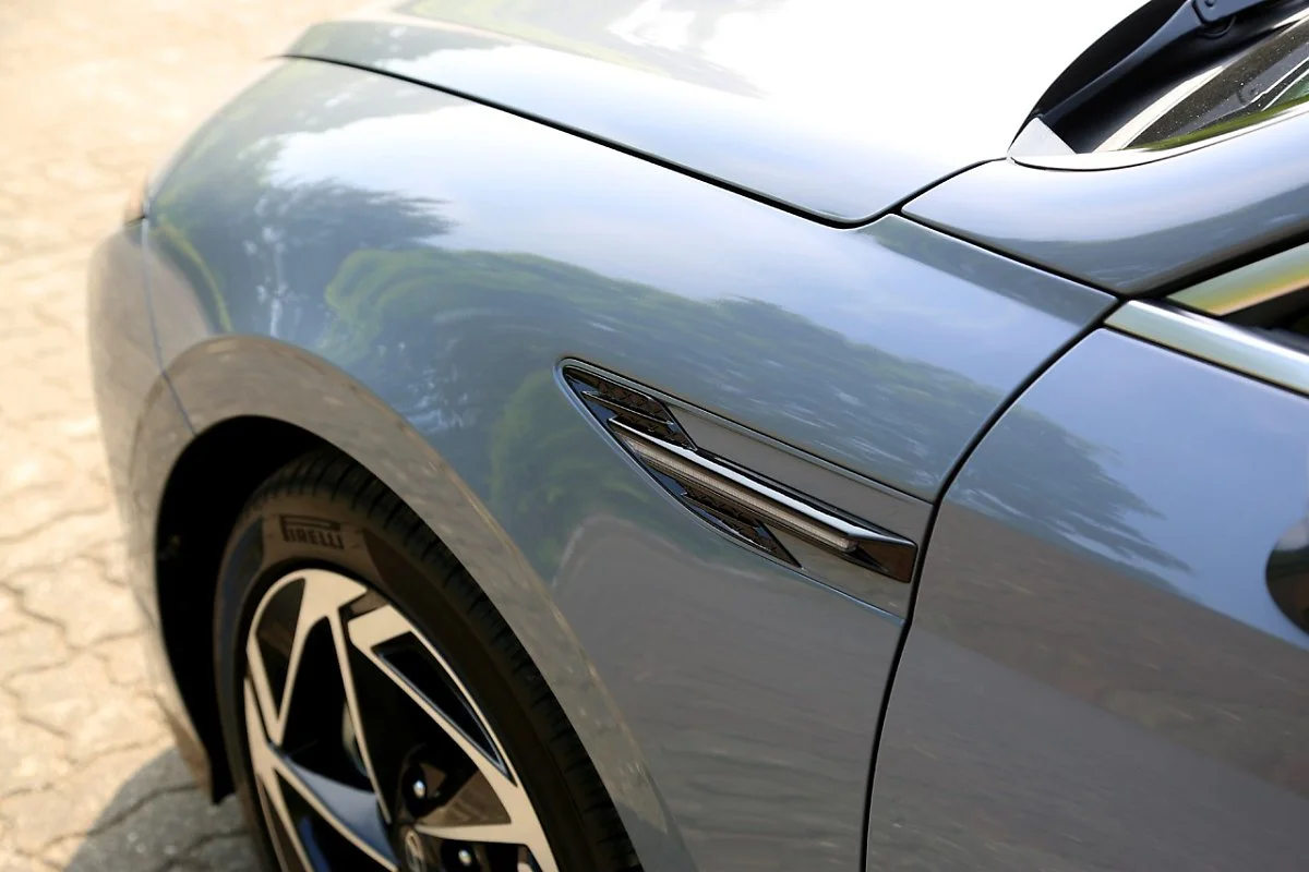 전면부에서 시작된 역동성은 측면에도 이어집니다. 앞쪽 펜더의 캐릭터 라인이 시작되는 부분에는 측면 방향지시등이 달렸는데요, 이 부분이 심리스 호라이즌 램프와 이어지는 느낌을 만들기도 합니다. 18인치 전면가공 휠은 특유의 역동적인 디자인이 인상적입니다. 자동차가 정지해있을 때도 앞으로 달려나가는 듯한 느낌을 주기에 충분하죠.