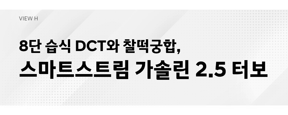 무엇보다도 스마트스트림 가솔린 2.5 터보의 강점은 여유로운 출력과 폭발적인 가속 성능입니다. 290마력의 최고출력과 43.0kg·m의 최대토크를 발휘합니다. 특히 최대토크의 경우 실주행 영역인 1,650rpm에서 4,000rpm까지 고르게 발생하는 만큼 묵직하고도 호쾌한 가속 성능을 남김없이 전달합니다. 최고출력이 발생하는 5,800rpm부터는 어느 속도에서든 여유로운 출력을 낼 수 있게 됩니다.