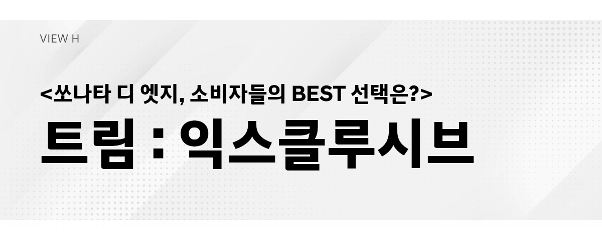 기본 트림부터 폭넓은 사양이 제공되는 쏘나타 디 엣지지만 소비자들에게 가장 많은 선택을 받은 트림은 33.1%의 선택률을 기록한 익스클루시브 트림입니다. 익스클루시브 트림은 프리미엄 트림보다 한 단계 높은 트림이며 쏘나타 디 엣지의 핵심 사양들이 대거 적용되는 트림입니다.