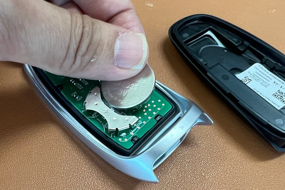 성공적으로 스마트키를 분리했다면, 나머지 할 일은 배터리를 교체하는 것 뿐입니다. 다만 3V 리튬 전지더라도 사이즈나 종류가 다를 수 있으니, 교체 전에 장착되어 있던 배터리 규격을 확인하고 동일한 배터리를 장착해주면 됩니다. 케이스에 표시된 양극(+)과 음극(-)을 잘 표시하는 것도 중요합니다. 반대 극성으로 끼우게 되면 작동이 되지 않을 뿐 아니라 과충전으로 고장이 발생할 수 있으니 주의가 필요합니다.