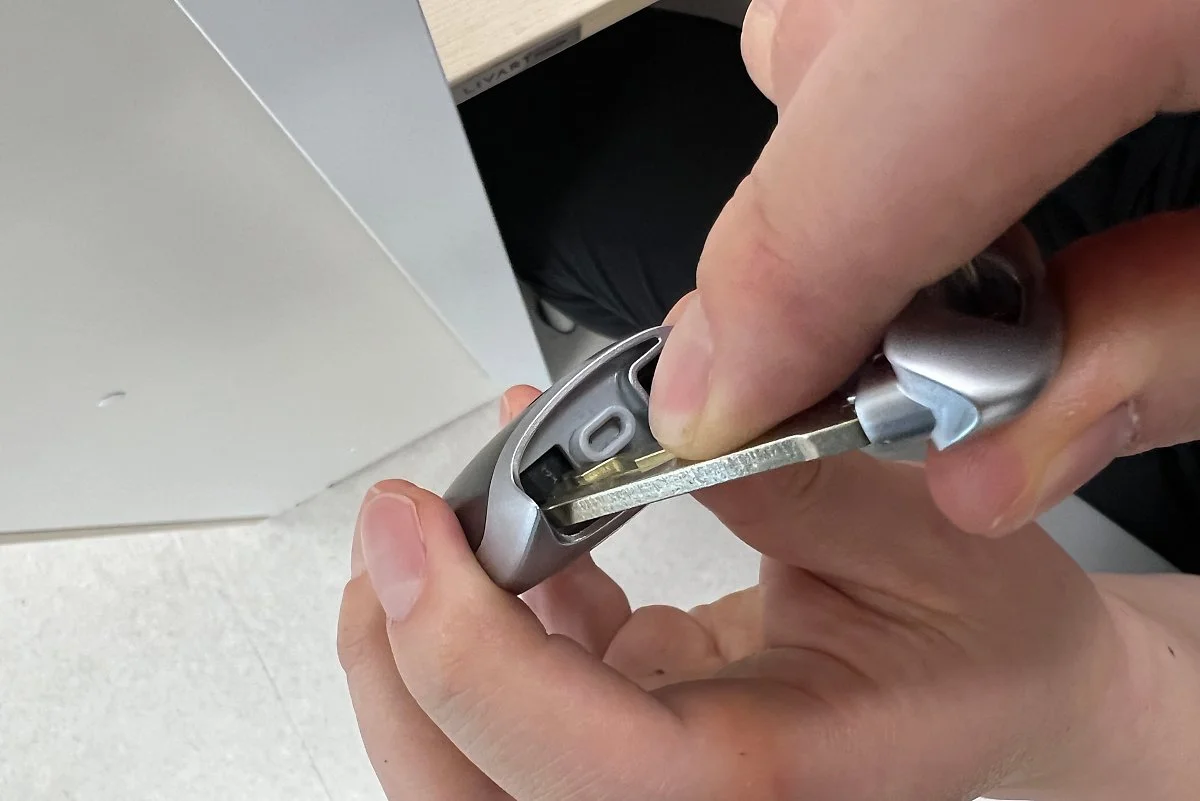 우선 차 문을 열 때처럼 실물 열쇠를 스마트키에서 분리합니다. 그런 뒤에는 키 내부나 측면에 위치한 홈에 실물 열쇠를 끼워 넣고 지렛대 원리로 틈 사이를 들어올립니다. 만약 실물 키가 들어갈 수 없을 만큼 홈이 작다면 일자드라이버를 사용해도 무관합니다.