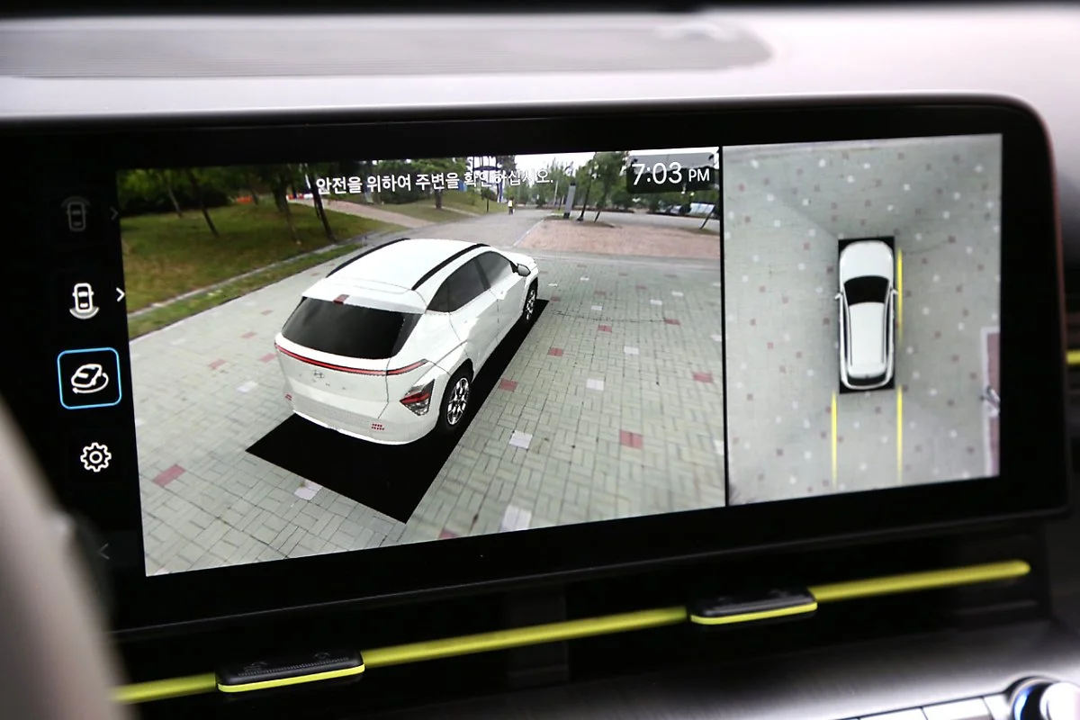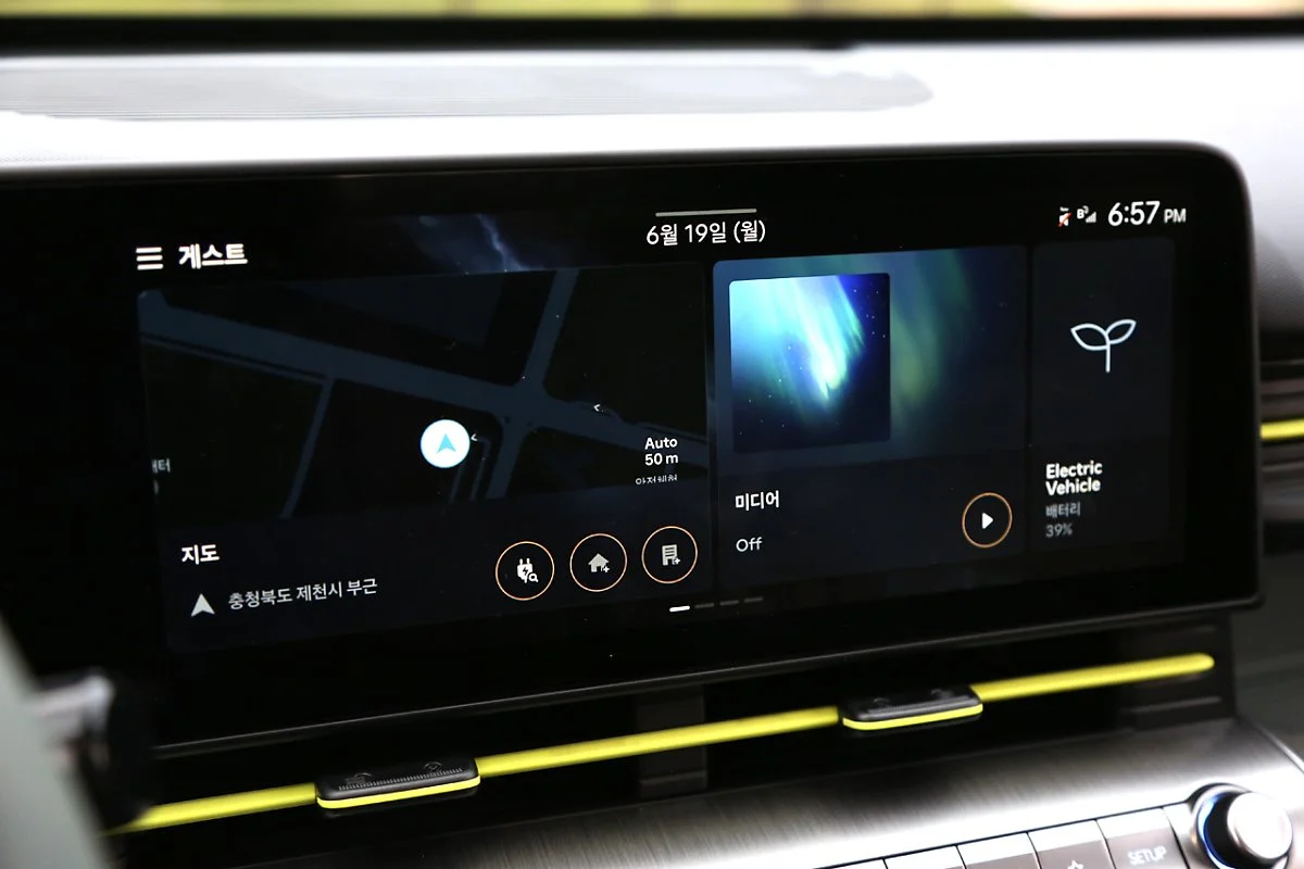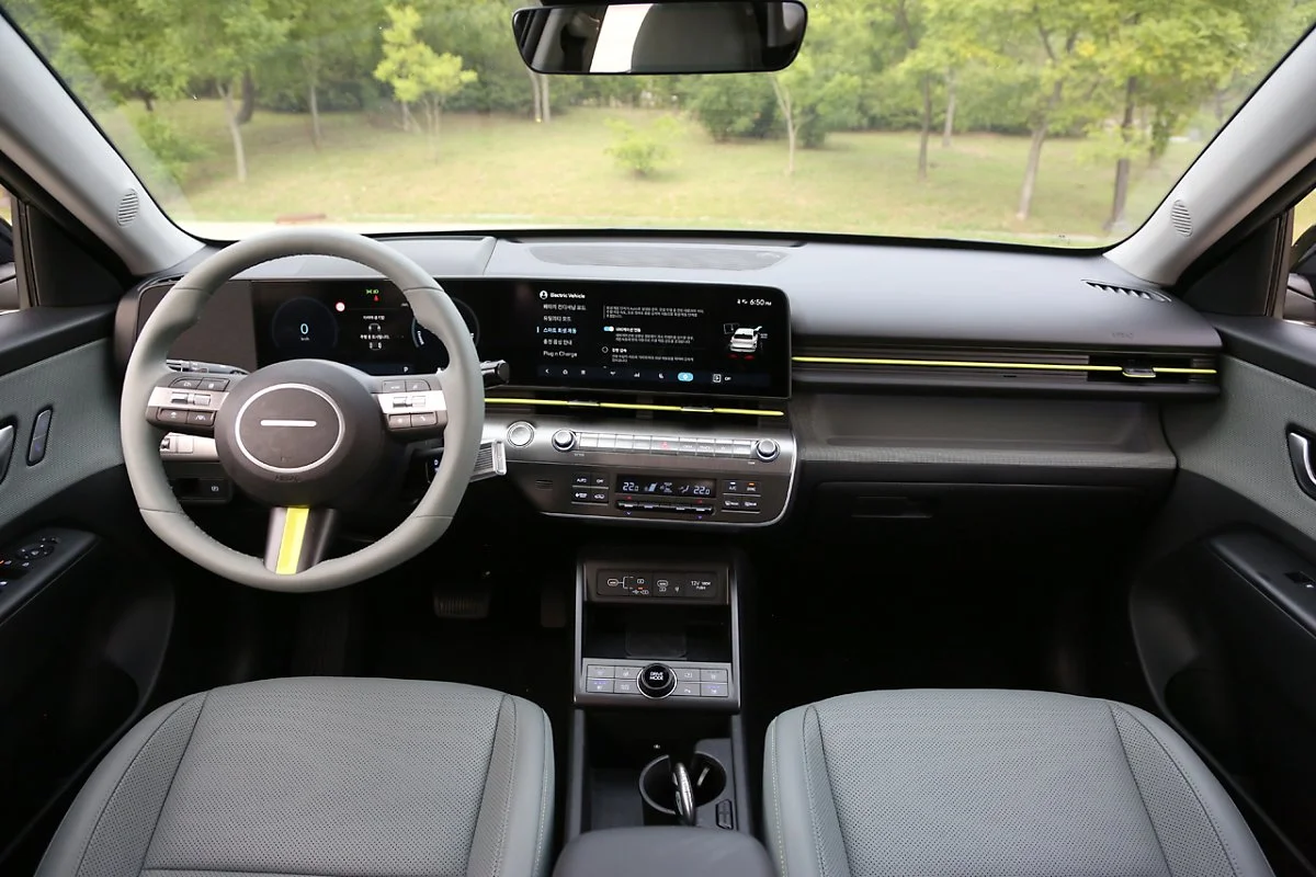디 올 뉴 코나의 실내는 구조를 획기적으로 개선해 편안하고 실용성을 높인 것이 특징입니다. 12.3인치 파노라믹 디스플레이를 배치해 고급스러운 분위기를 연출했으며, 칼럼식 변속 기어를 통해 센터 콘솔의 공간 활용성도 높였습니다. 친환경 차임을 나타내듯 스티어링 휠과 송풍구에 강조된 라임색 포인트는 한편으로는 귀엽다는 느낌도 들게 합니다.